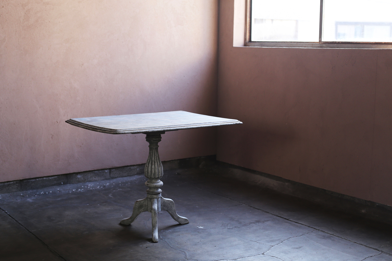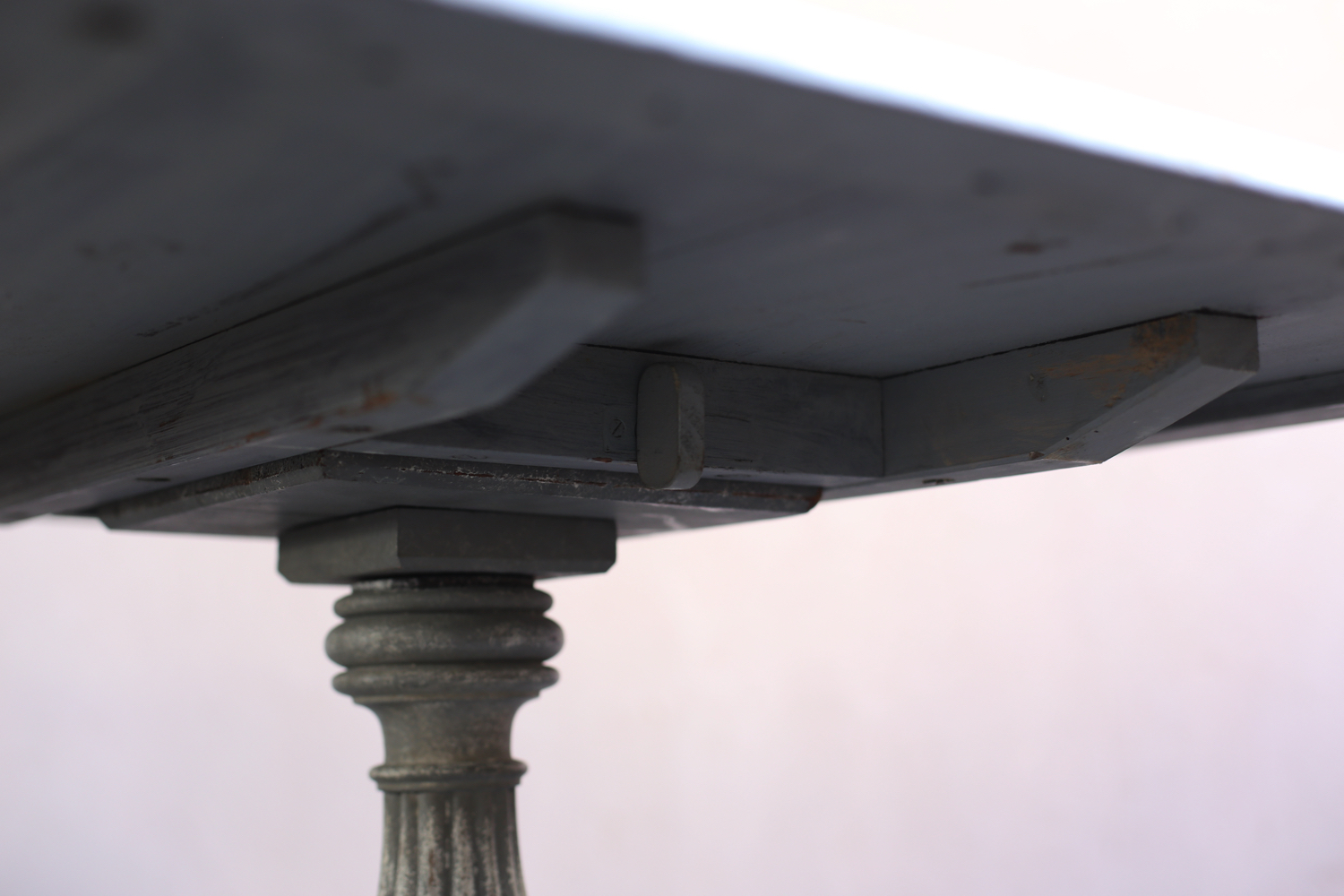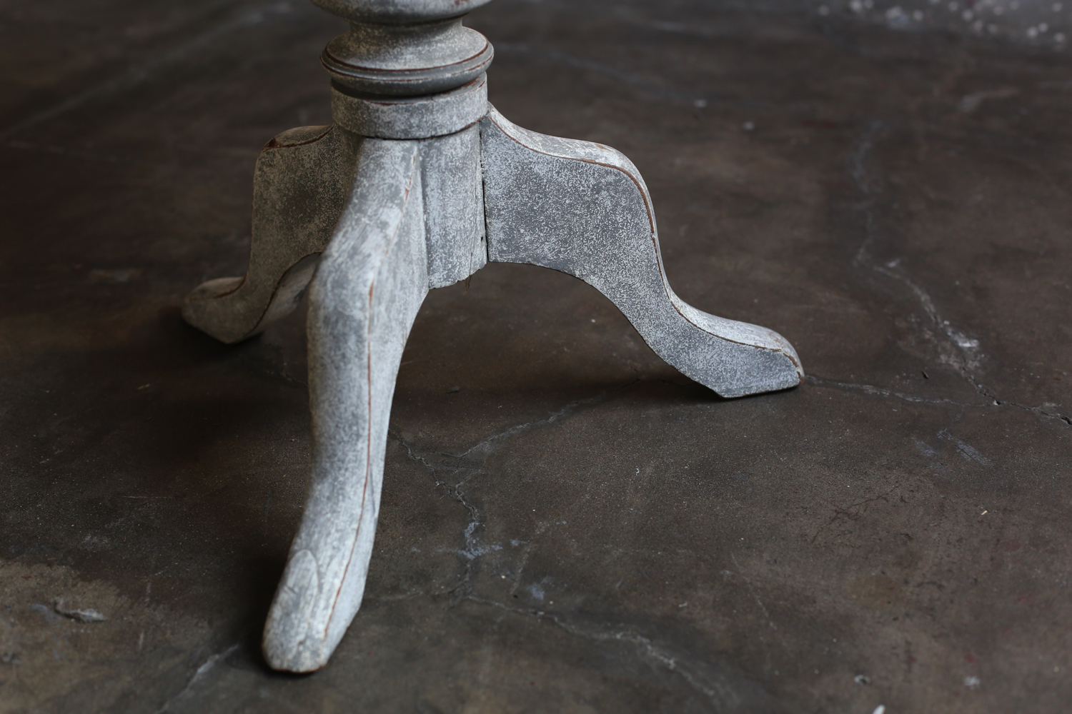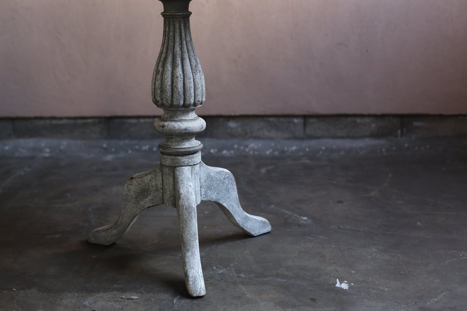 19世紀フランス製のティルトトップ・ペデスタルテーブル。四角い天板は折り畳み機構によって垂直に立てられる構造を持ち、限られた空間での収納性と実用性を兼ね備えています。バルボス装飾が施されたセンターレッグと三脚のベースは、優美さと安定感を両立。グレーがかったペイントの経年変化が美しく、農村部から都市部まで幅広く用いられたフランス日常家具の典型を示しています。