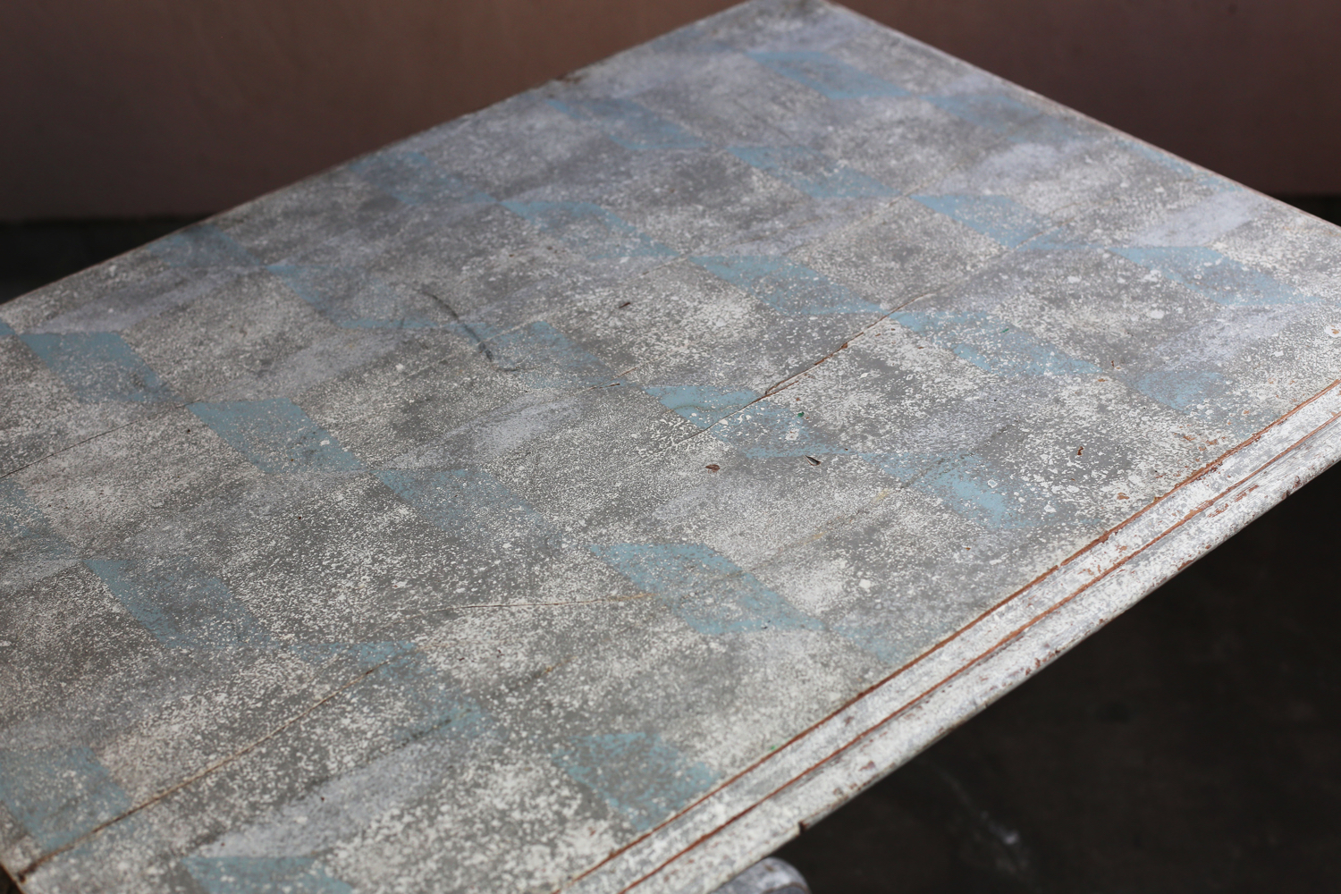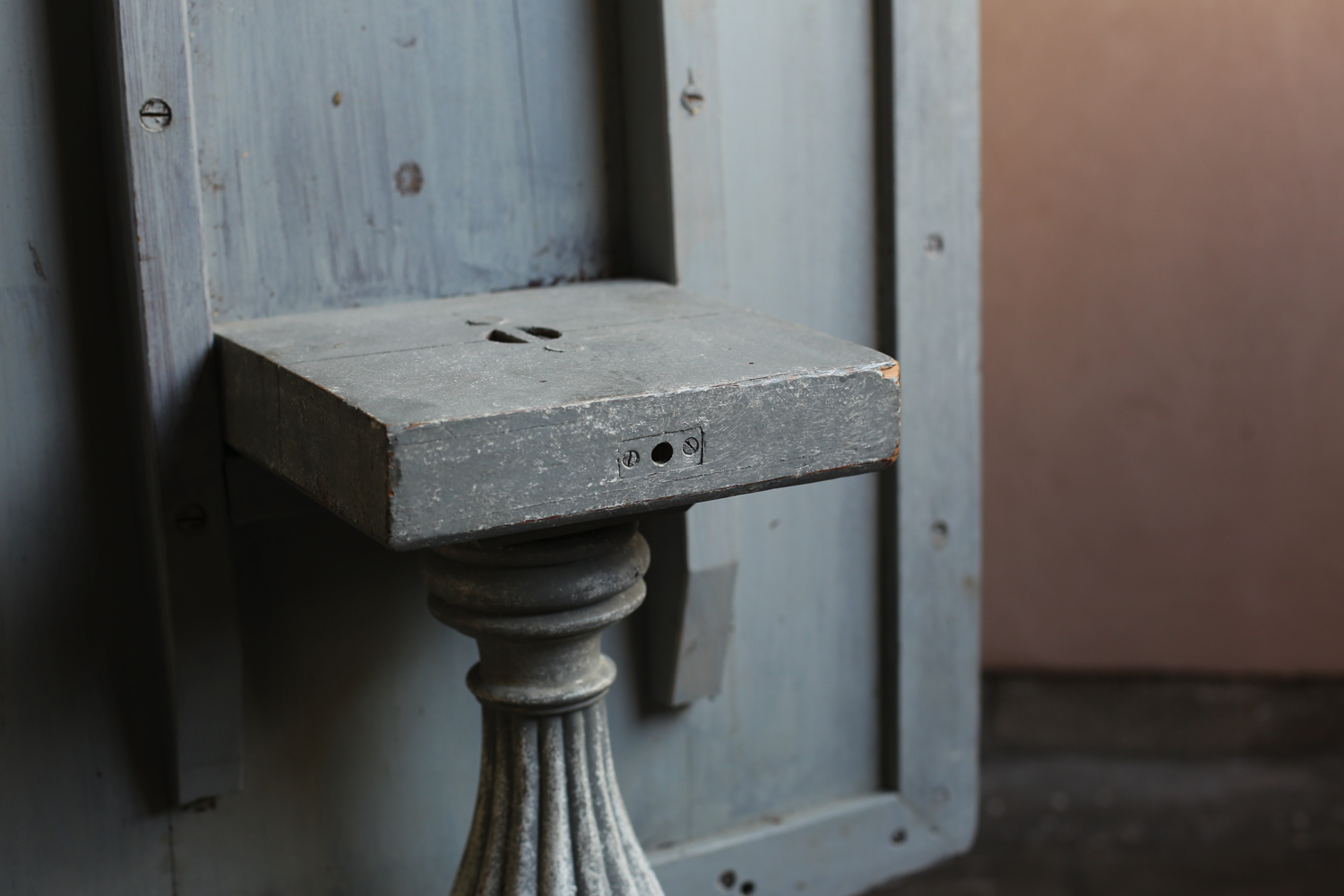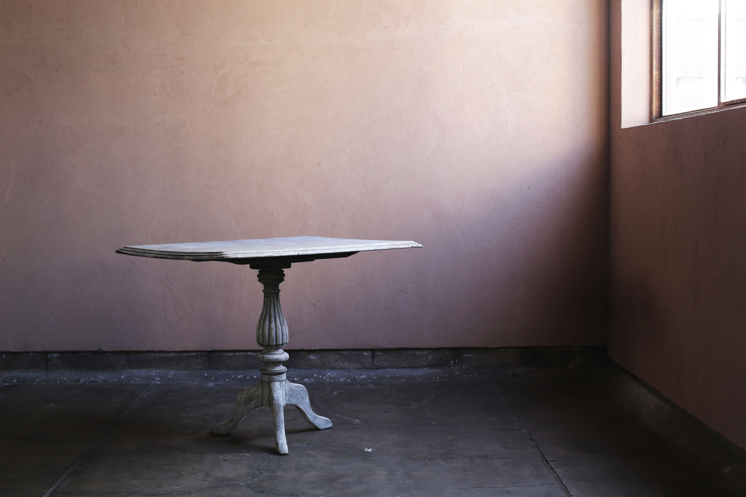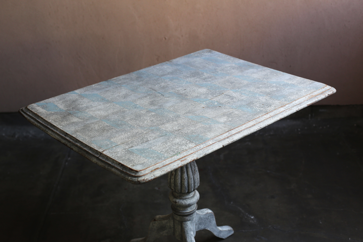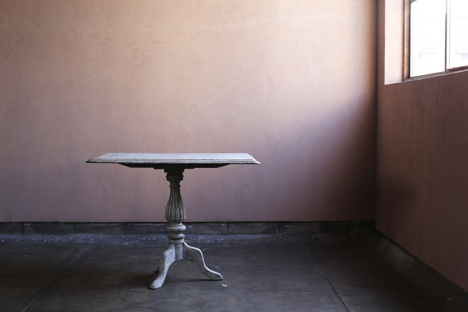 19世紀フランス製のティルトトップ・ペデスタルテーブル。四角い天板は折り畳み機構によって垂直に立てられる構造を持ち、限られた空間での収納性と実用性を兼ね備えています。バルボス装飾が施されたセンターレッグと三脚のベースは、優美さと安定感を両立。グレーがかったペイントの経年変化が美しく、農村部から都市部まで幅広く用いられたフランス日常家具の典型を示しています。