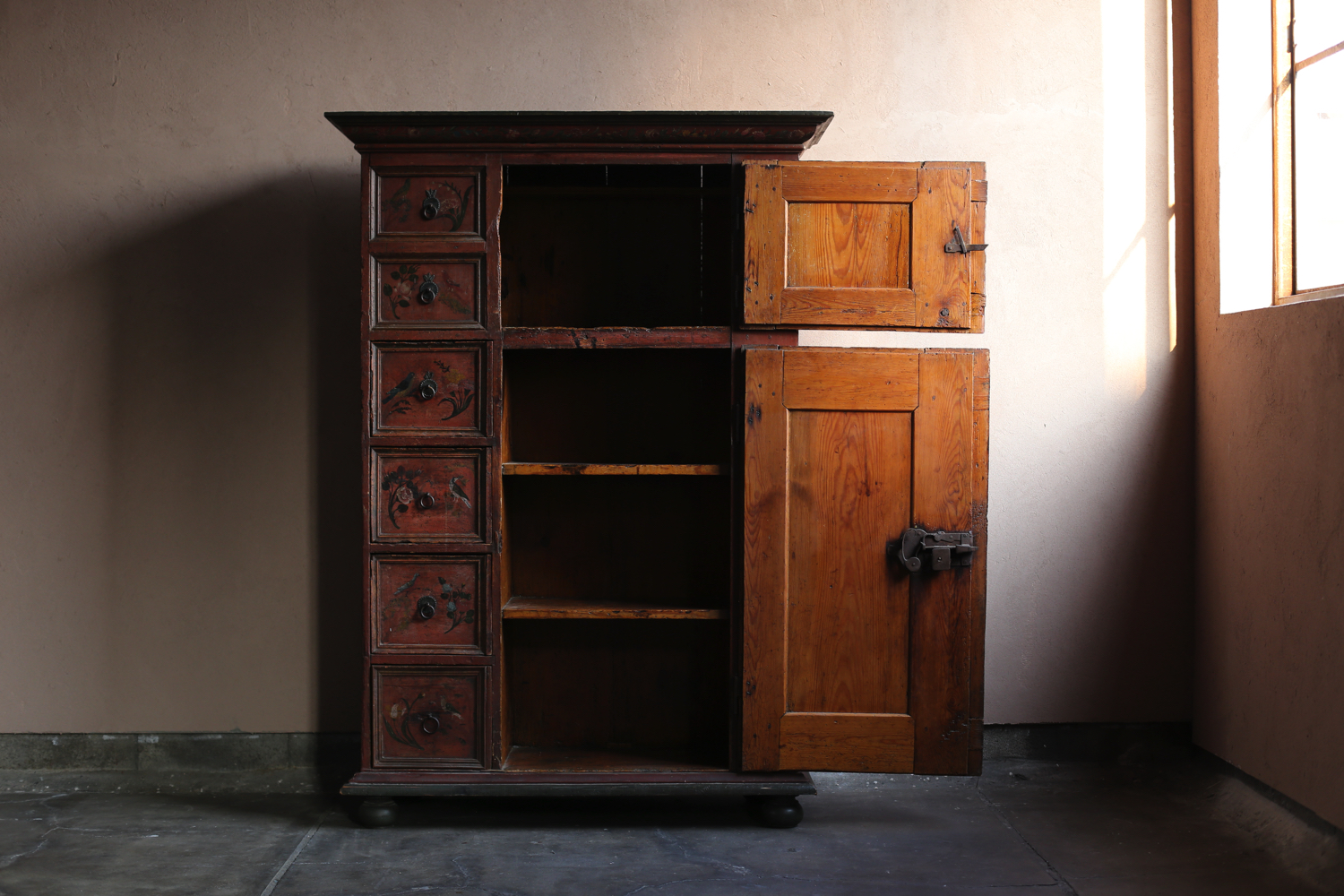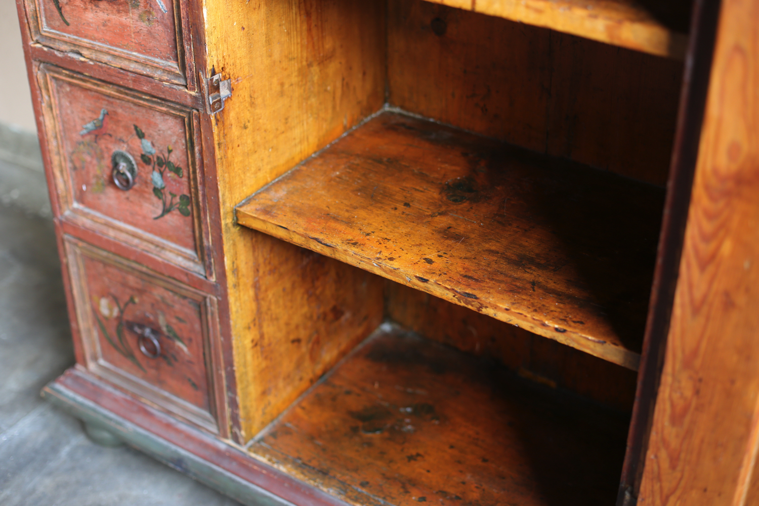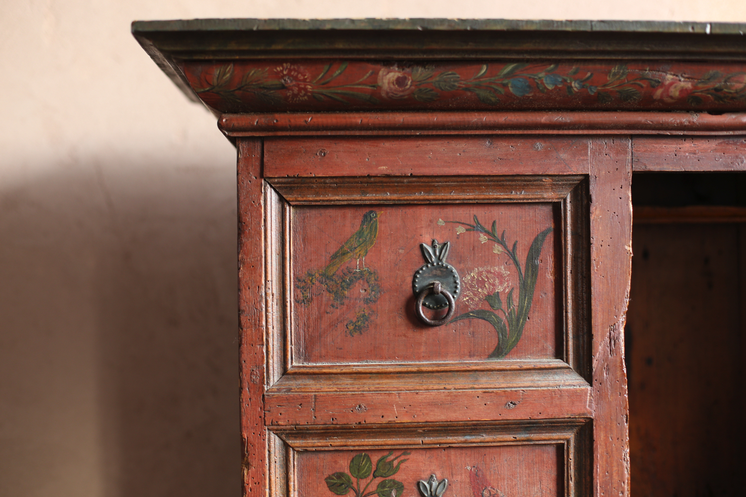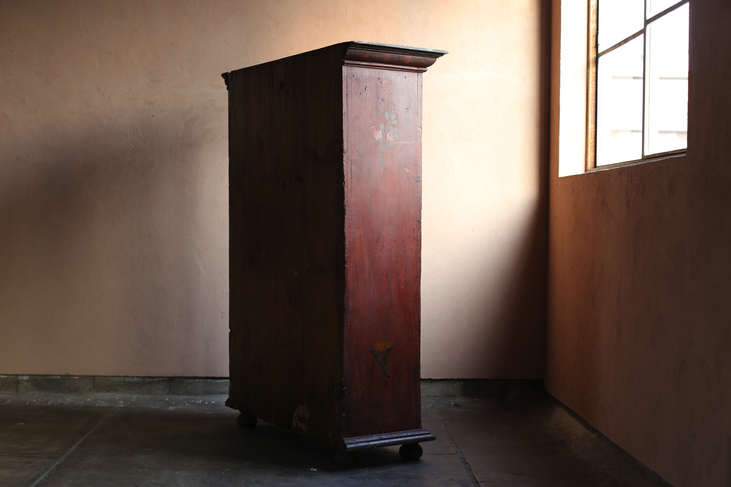 1835年の銘を持つこの彩色キャビネットは、イタリア北部アルプス山間部(トレンティーノ=アルト・アディジェ地方)で制作されたと考えられます。