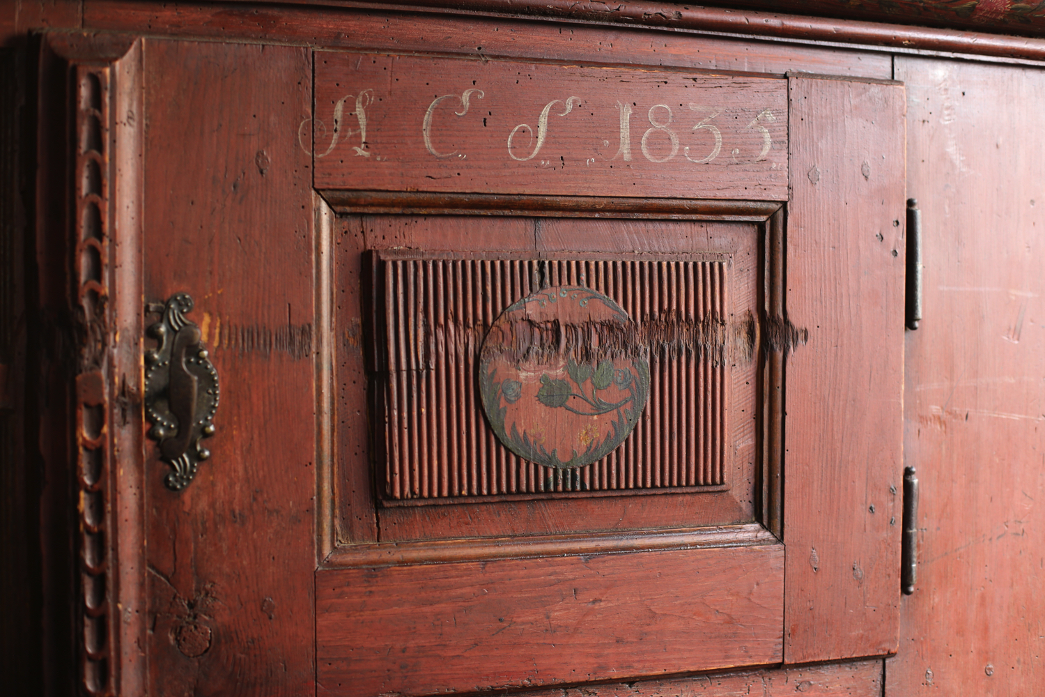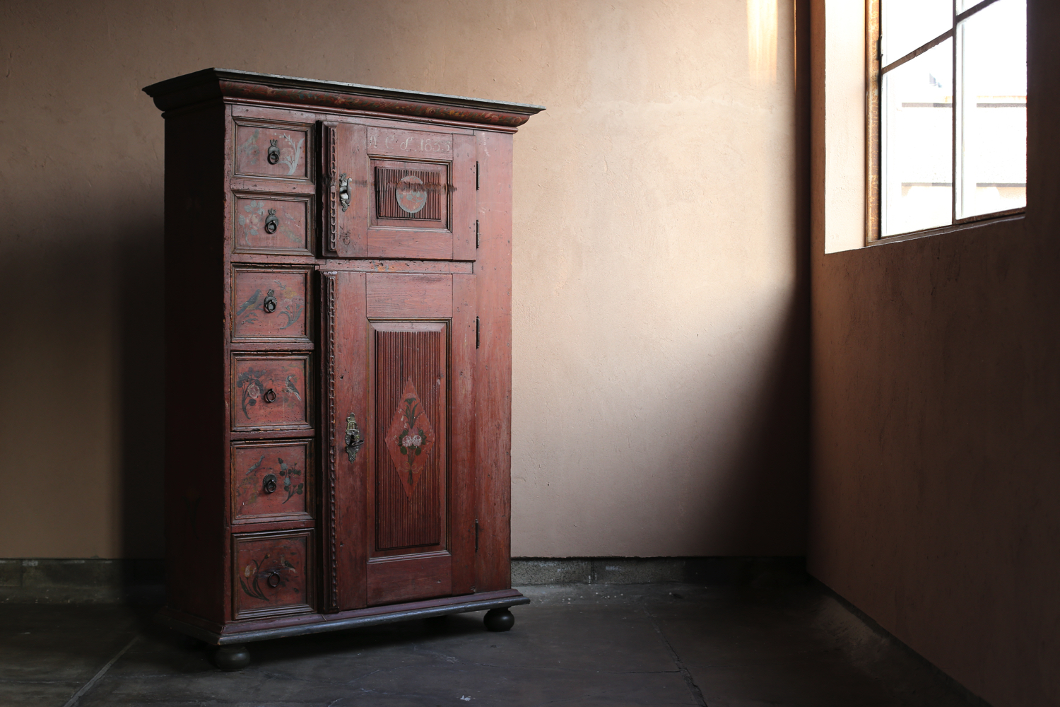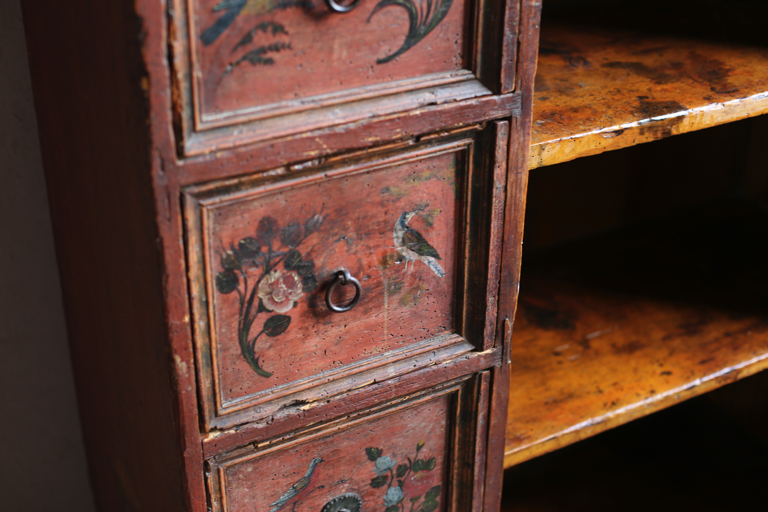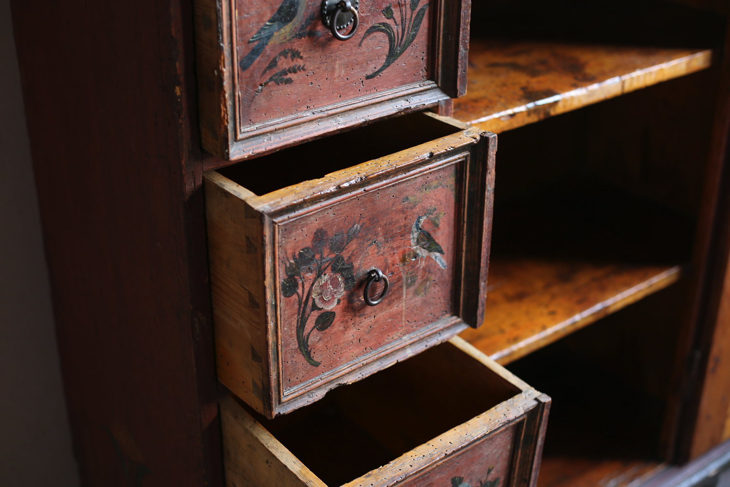 1835年の銘を持つこの彩色キャビネットは、イタリア北部アルプス山間部(トレンティーノ=アルト・アディジェ地方)で制作されたと考えられます。