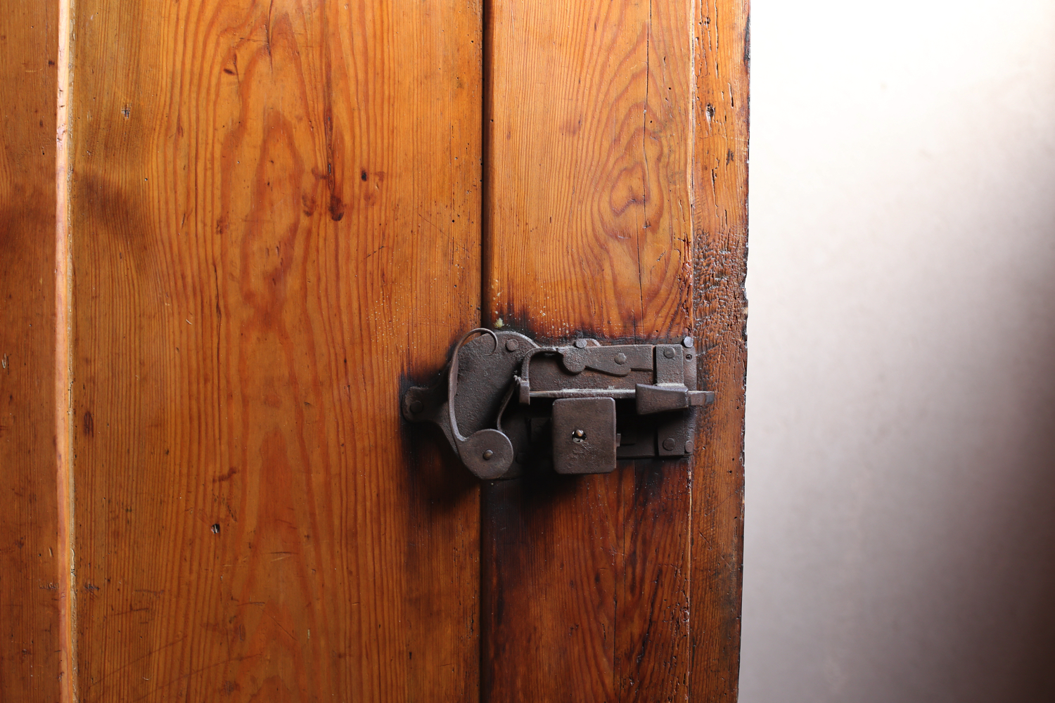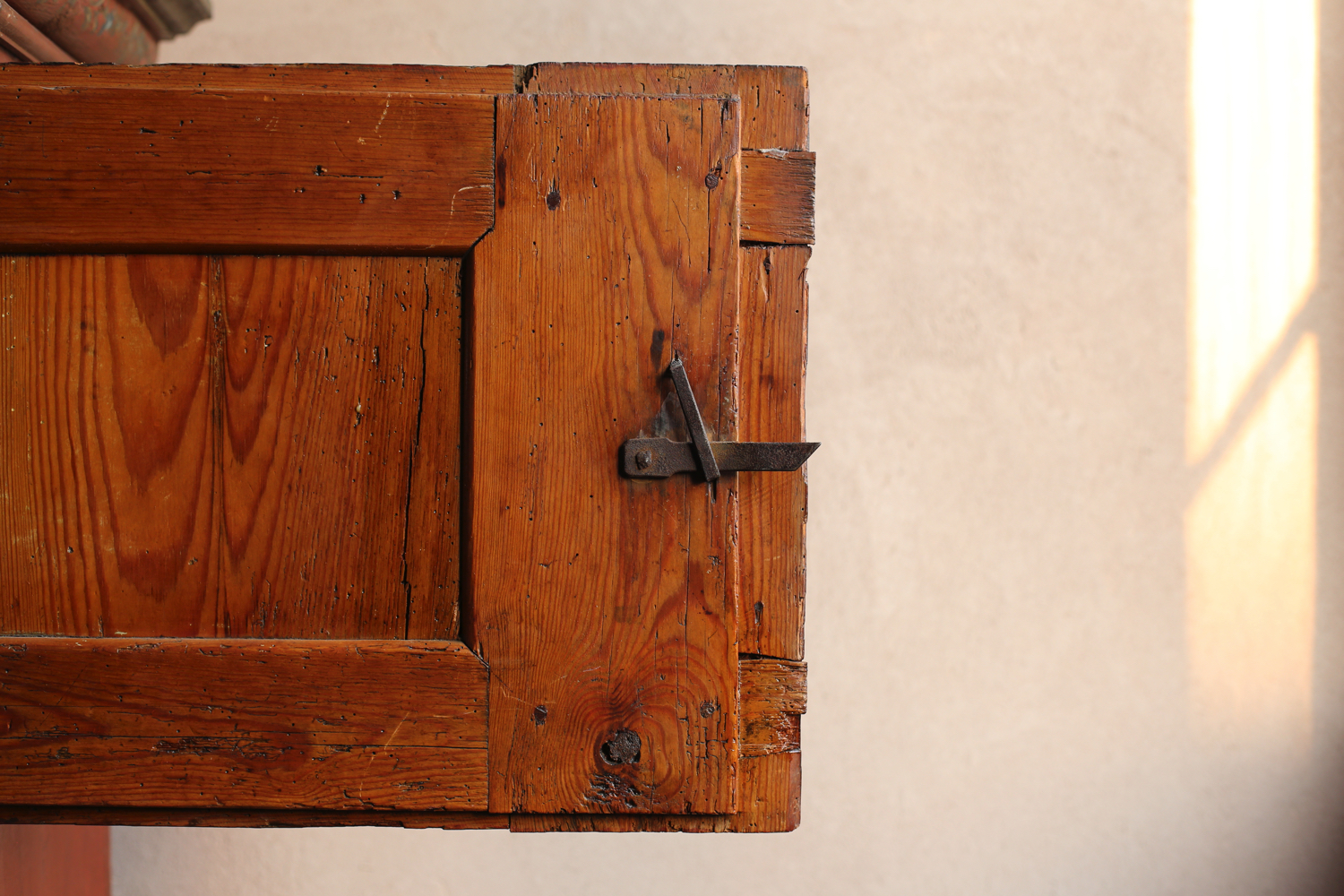 力強い構造をもつ松材を用い、扉や抽斗前板に花や果実を描いた華やかなポリクローム装飾が施されています。こうした装飾家具は、婚礼や持参金のために誂えられることが多く、当時の農村文化における暮らしと信仰を色濃く反映しています。