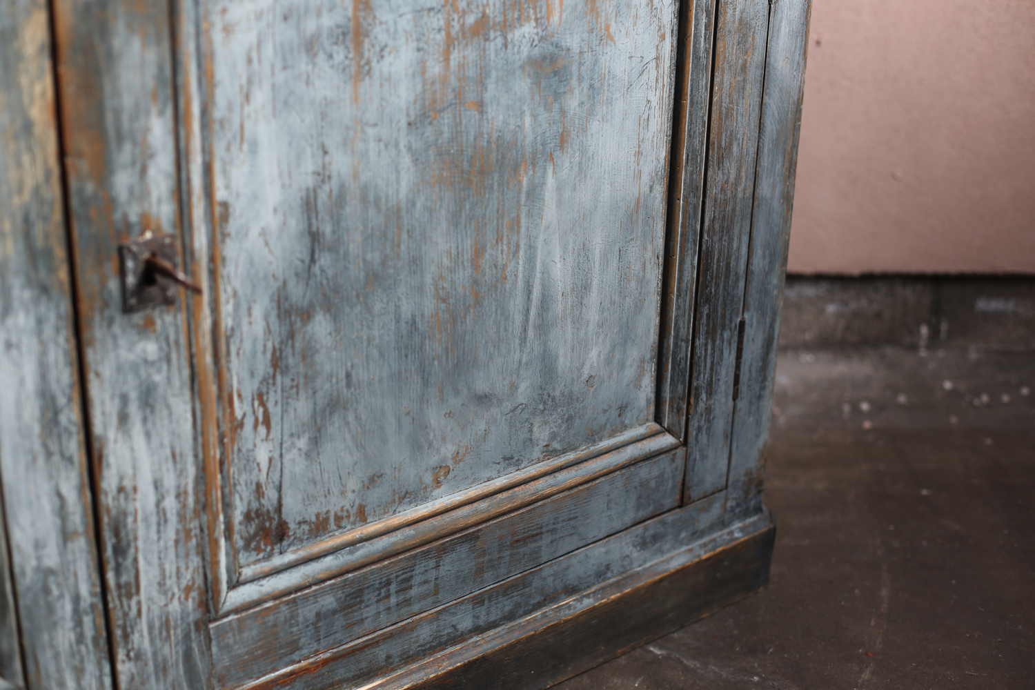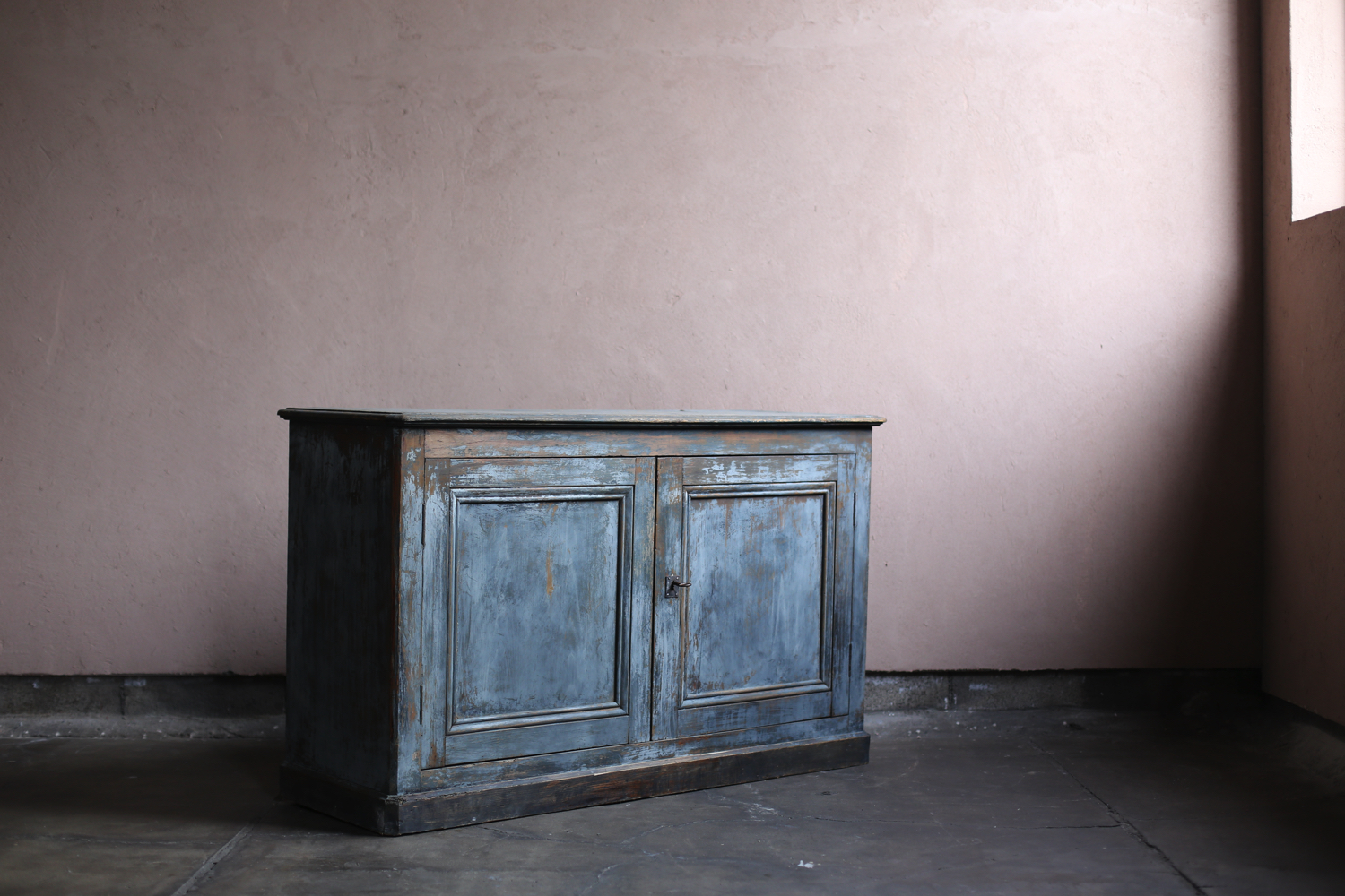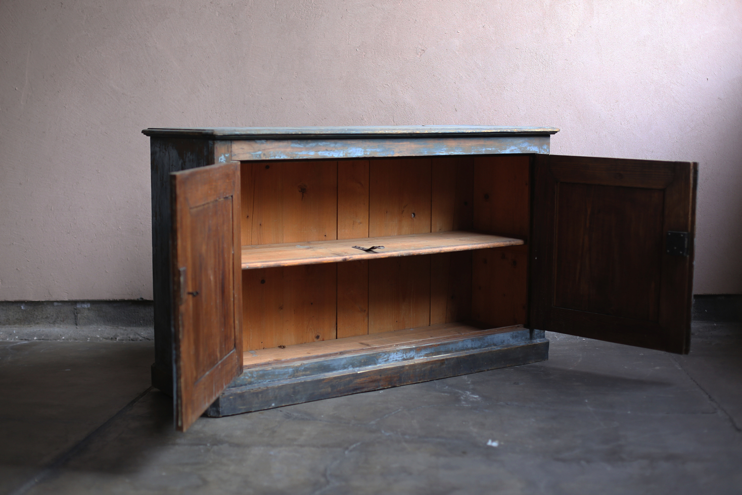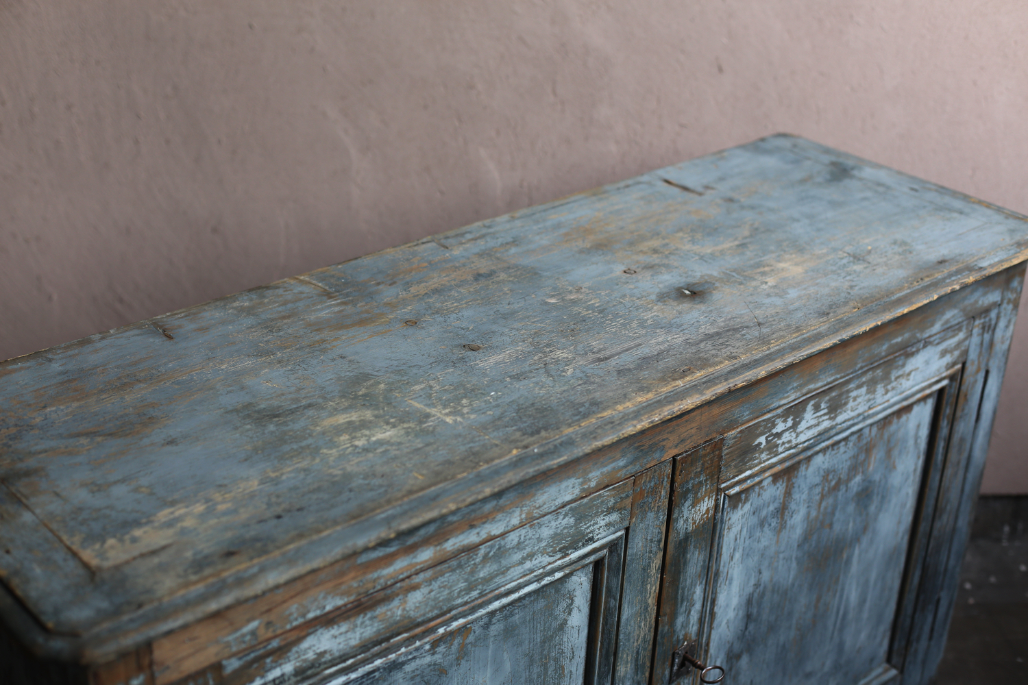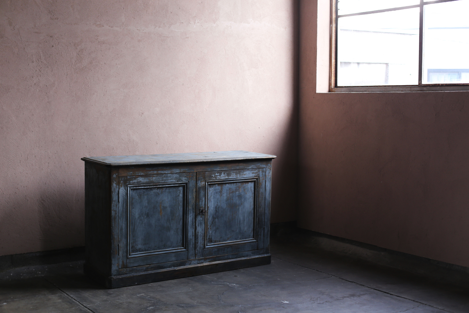深みのあるブルーグレーのペイントが印象的なアンティークキャビネット。時を経て摩耗した塗装からは木地がのぞき、独特の陰影を生み出しています。二枚扉のシンプルな構造ながらも、直線的な面取りやわずかに張り出した天板などの意匠が加わり、実用性と美観を兼ね備えた仕上がり。