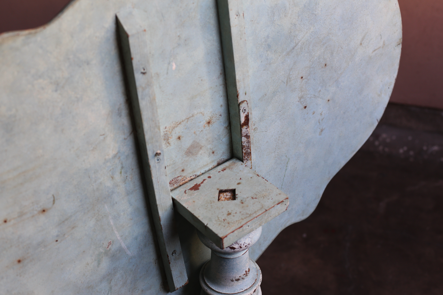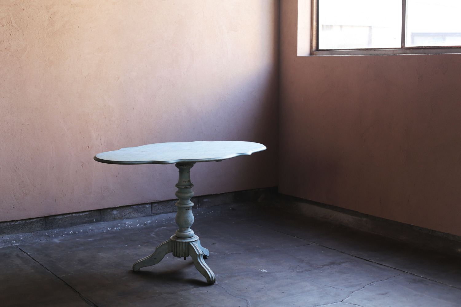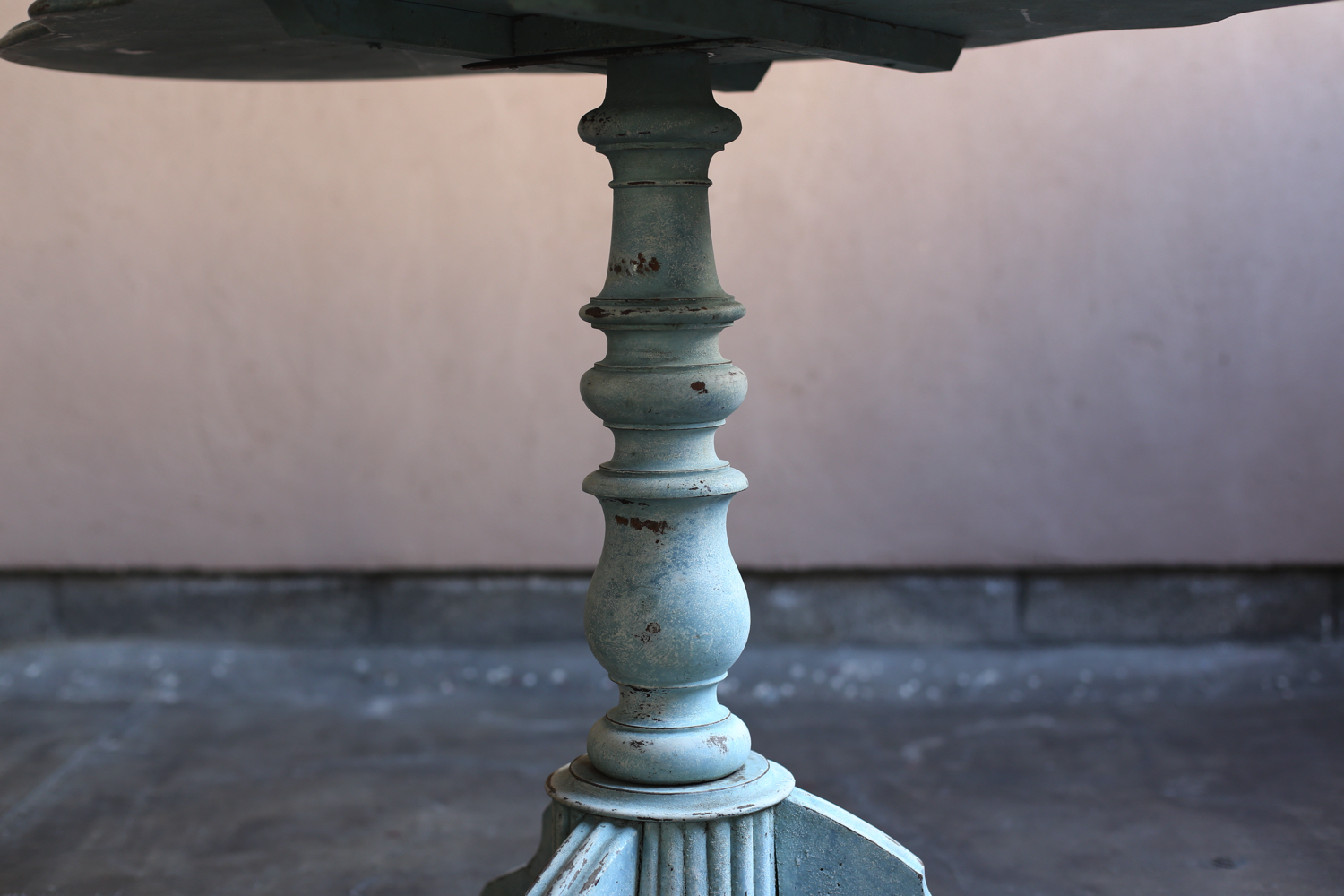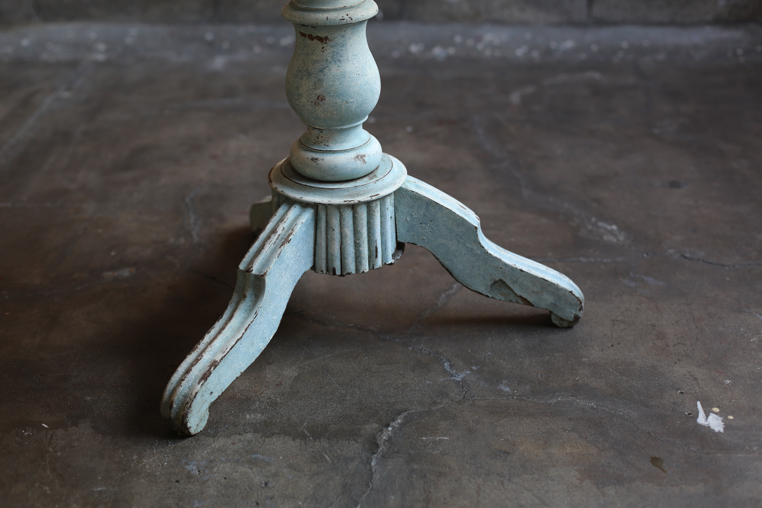 フランス19世紀のペデスタルテーブル。柔らかなブルーグレーのペイントが施され、経年により落ち着いた風合いを纏っています。波打つようなエッジを持つ天板と、優美に挽かれたセンターレッグ、三本脚の基部がバランスよく調和。素朴さと装飾性を兼ね備えたデザインは、田園の邸宅やブルジョワ家庭で愛用された家具の典型を物語ります。
