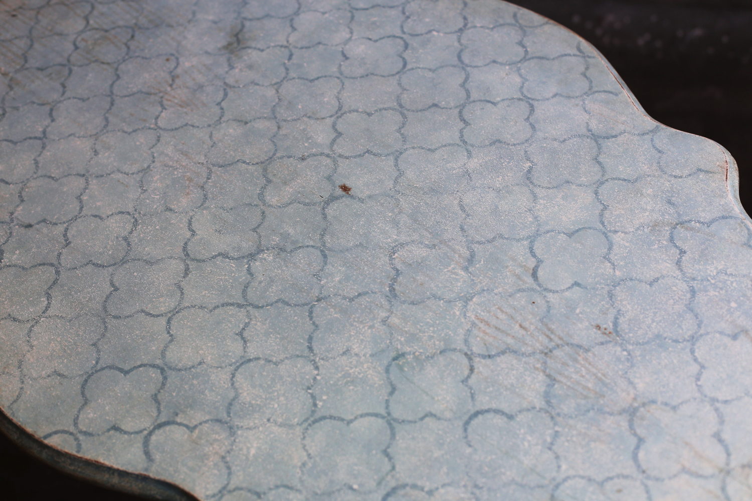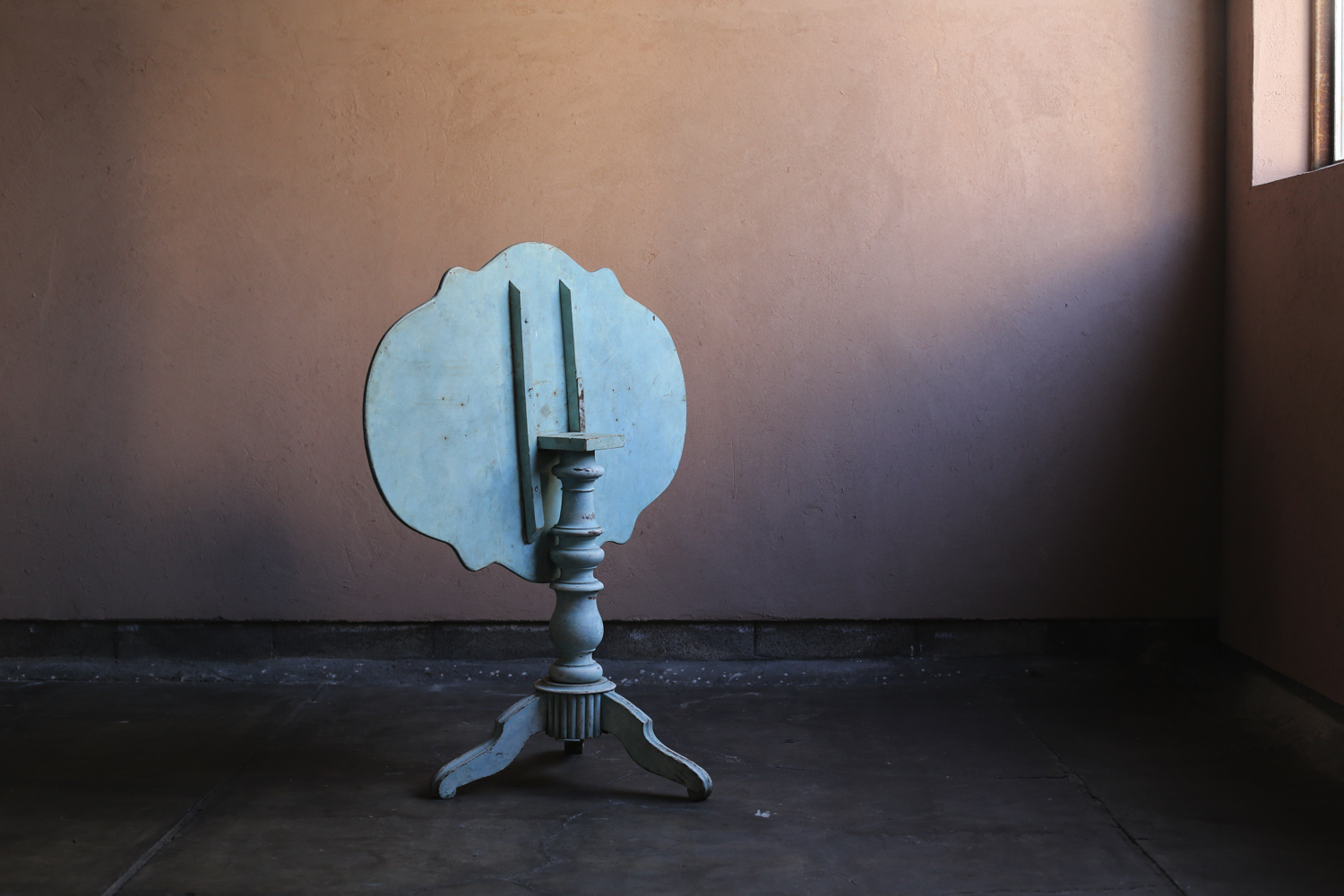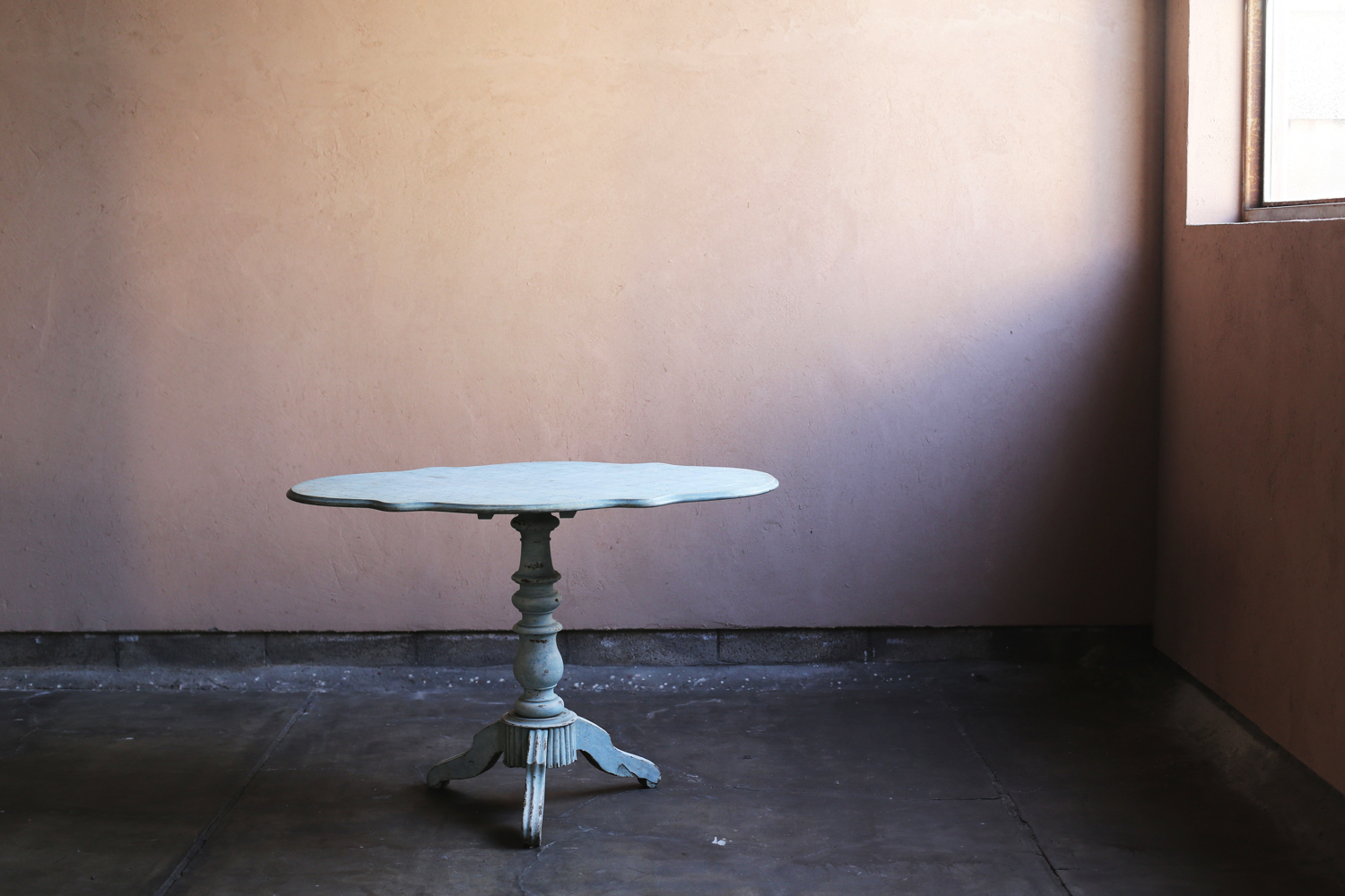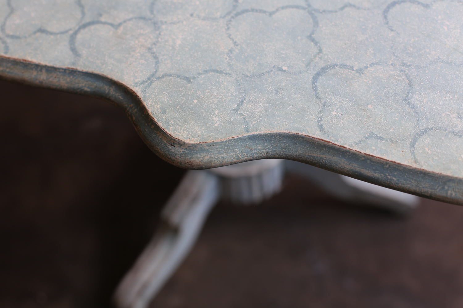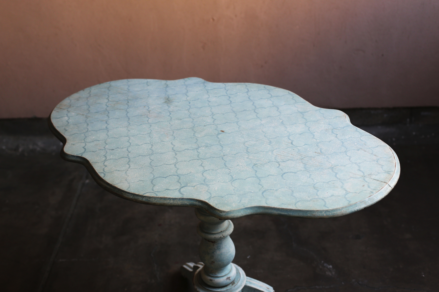 フランス19世紀のペデスタルテーブル。柔らかなブルーグレーのペイントが施され、経年により落ち着いた風合いを纏っています。波打つようなエッジを持つ天板と、優美に挽かれたセンターレッグ、三本脚の基部がバランスよく調和。素朴さと装飾性を兼ね備えたデザインは、田園の邸宅やブルジョワ家庭で愛用された家具の典型を物語ります。