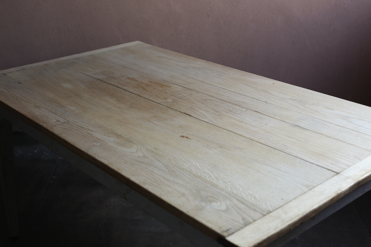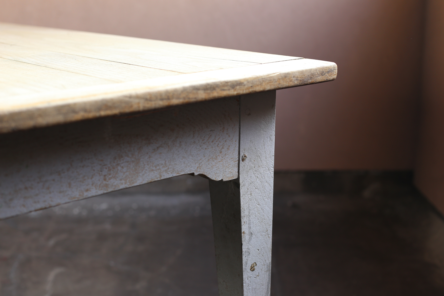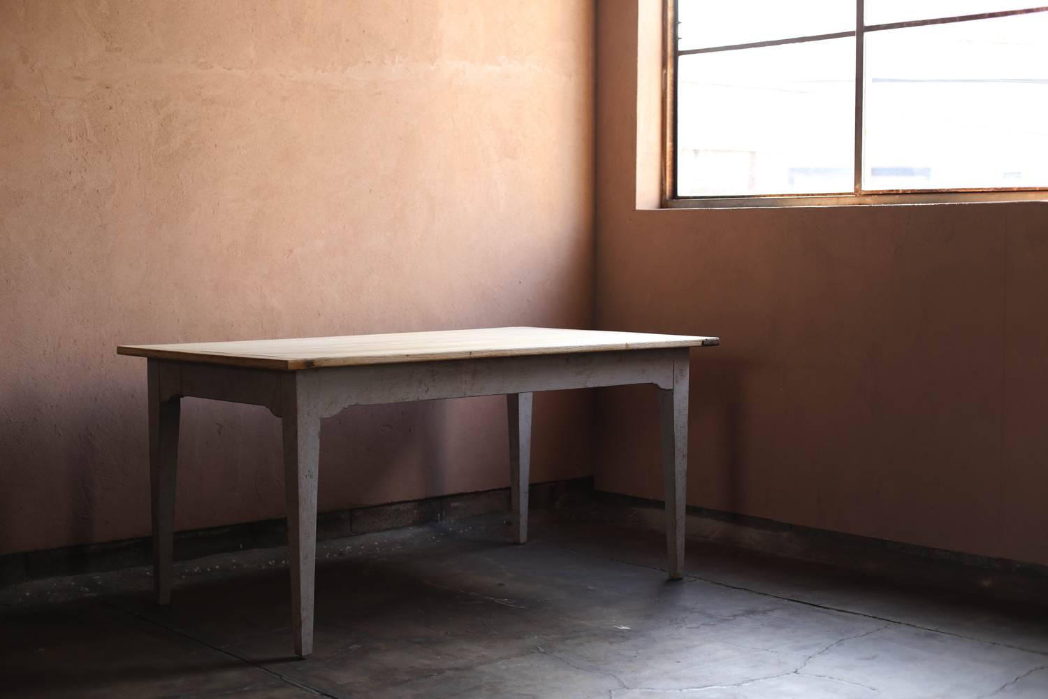 フランス20世紀初頭のファームハウステーブル。シンプルな直線構成とテーパードレッグが特徴で、日常の食卓や作業台として長く愛用されてきた実用家具です。グレーがかった淡いペイントは時の経過によって自然に剥がれ落ち、素朴で詩的な風合いを纏っています。南仏の田園住宅からパリ郊外の町家に至るまで幅広く用いられた、フランス農村家具の典型例であり、空間に温かみと落ち着きをもたらす一品です。