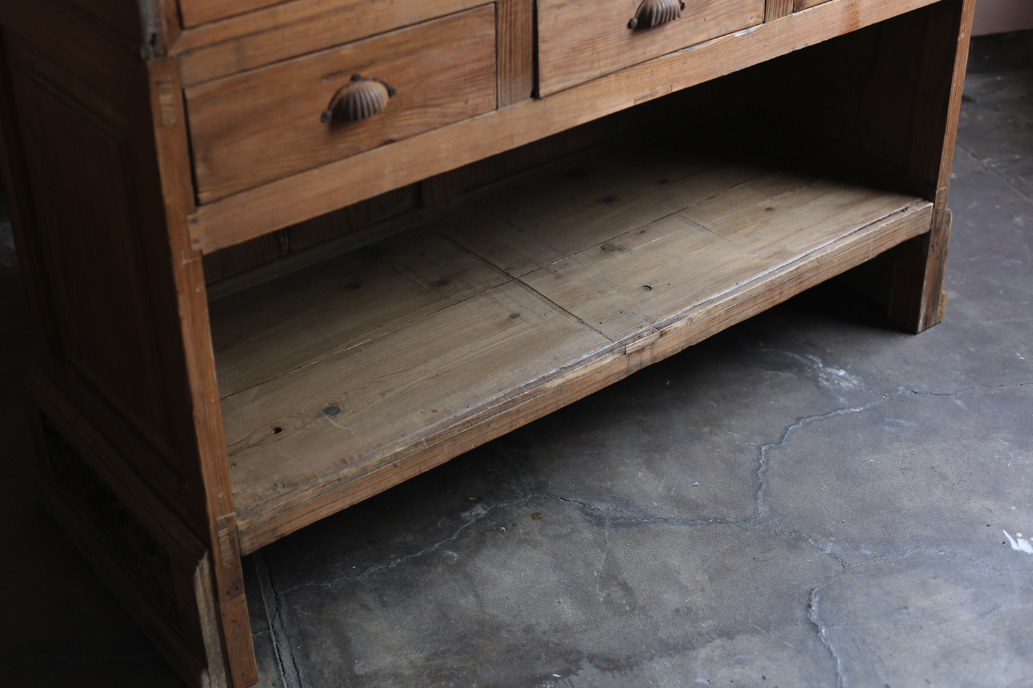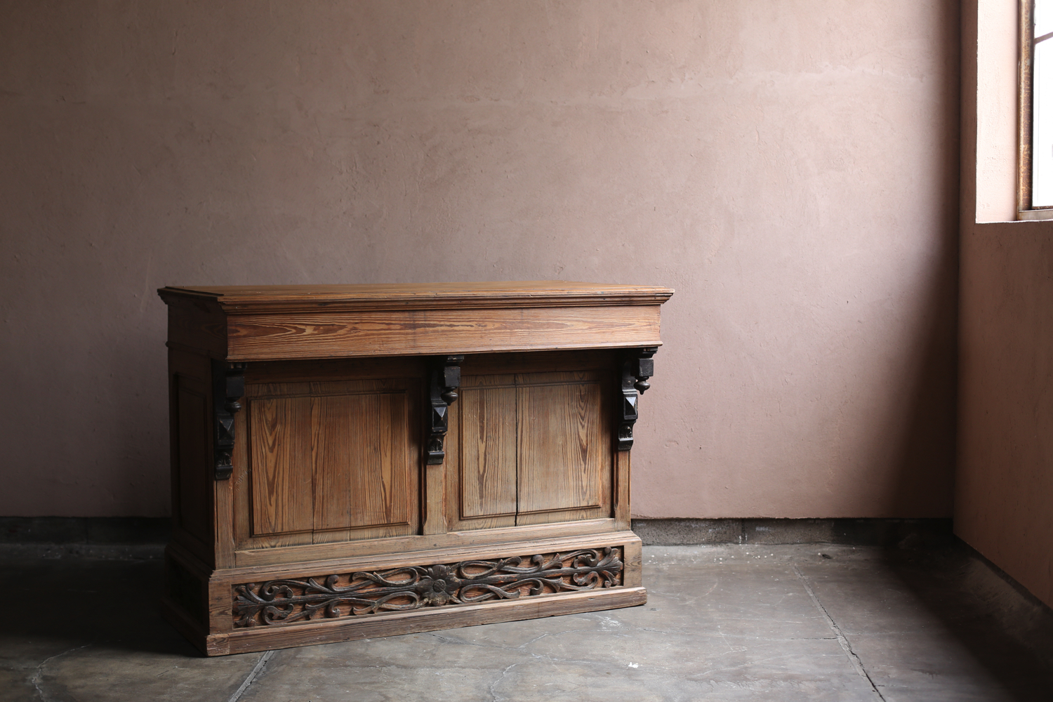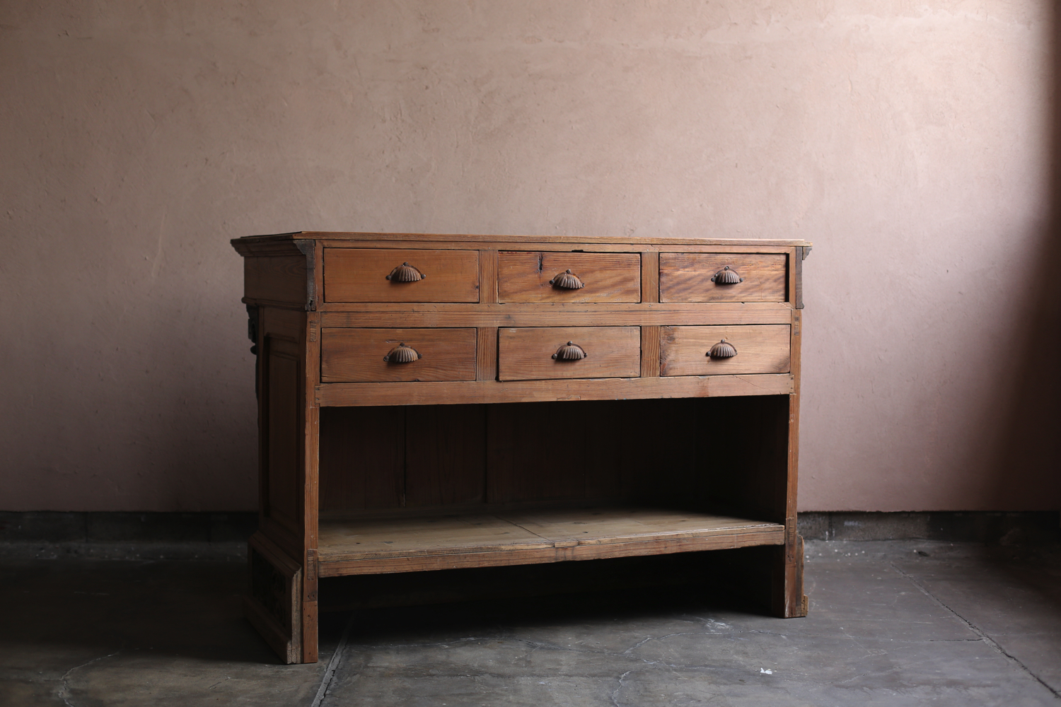 シンプルな構造でありながら、随所に意匠を凝らした造形は、当時の職人の高い技術を物語ります。ショップカウンターやレジ台としても映える存在であり、空間全体にアンティークならではの奥行きを与える一台です。
