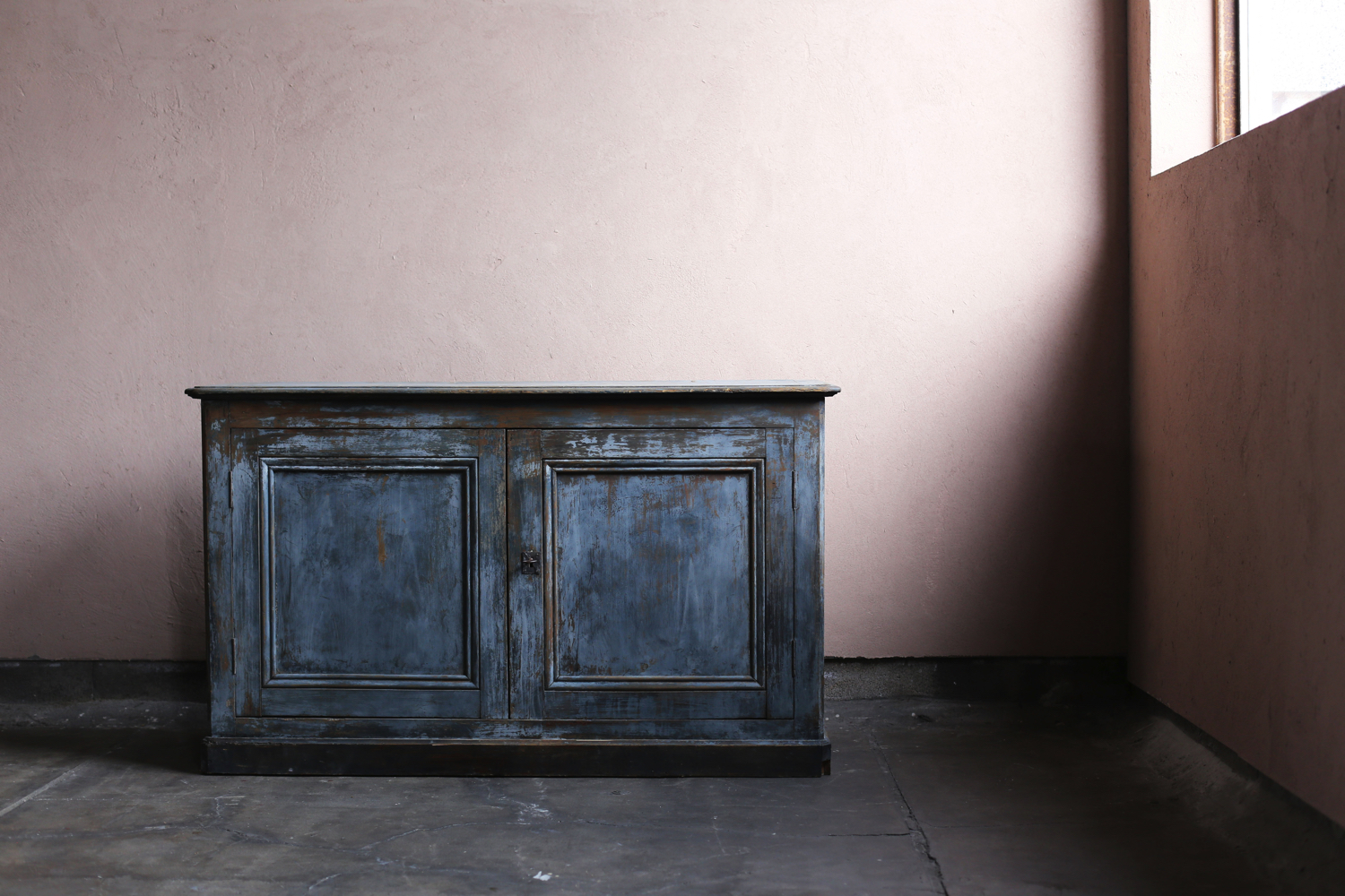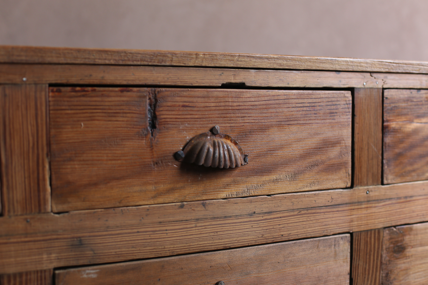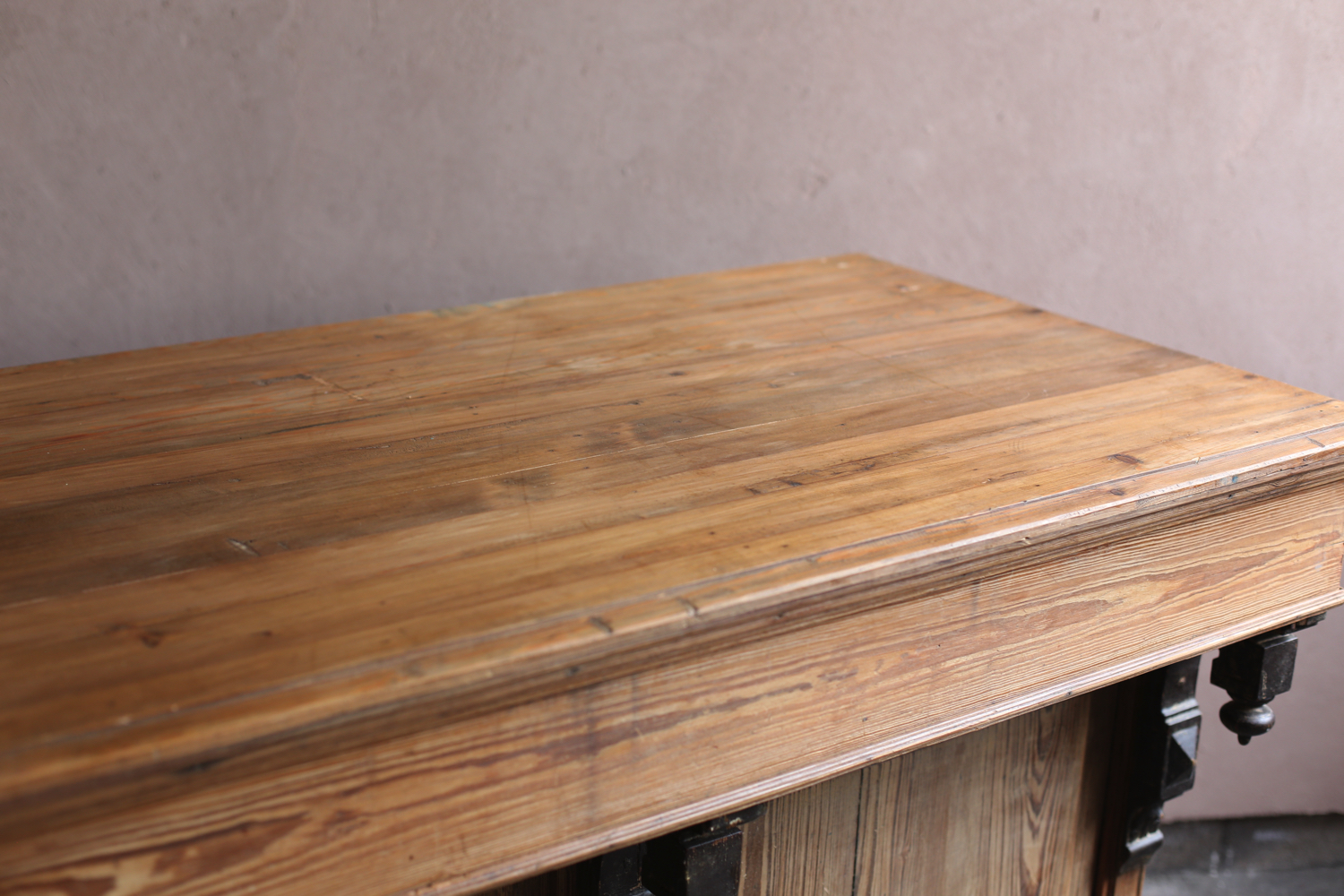 シンプルな構造でありながら、随所に意匠を凝らした造形は、当時の職人の高い技術を物語ります。ショップカウンターやレジ台としても映える存在であり、空間全体にアンティークならではの奥行きを与える一台です。