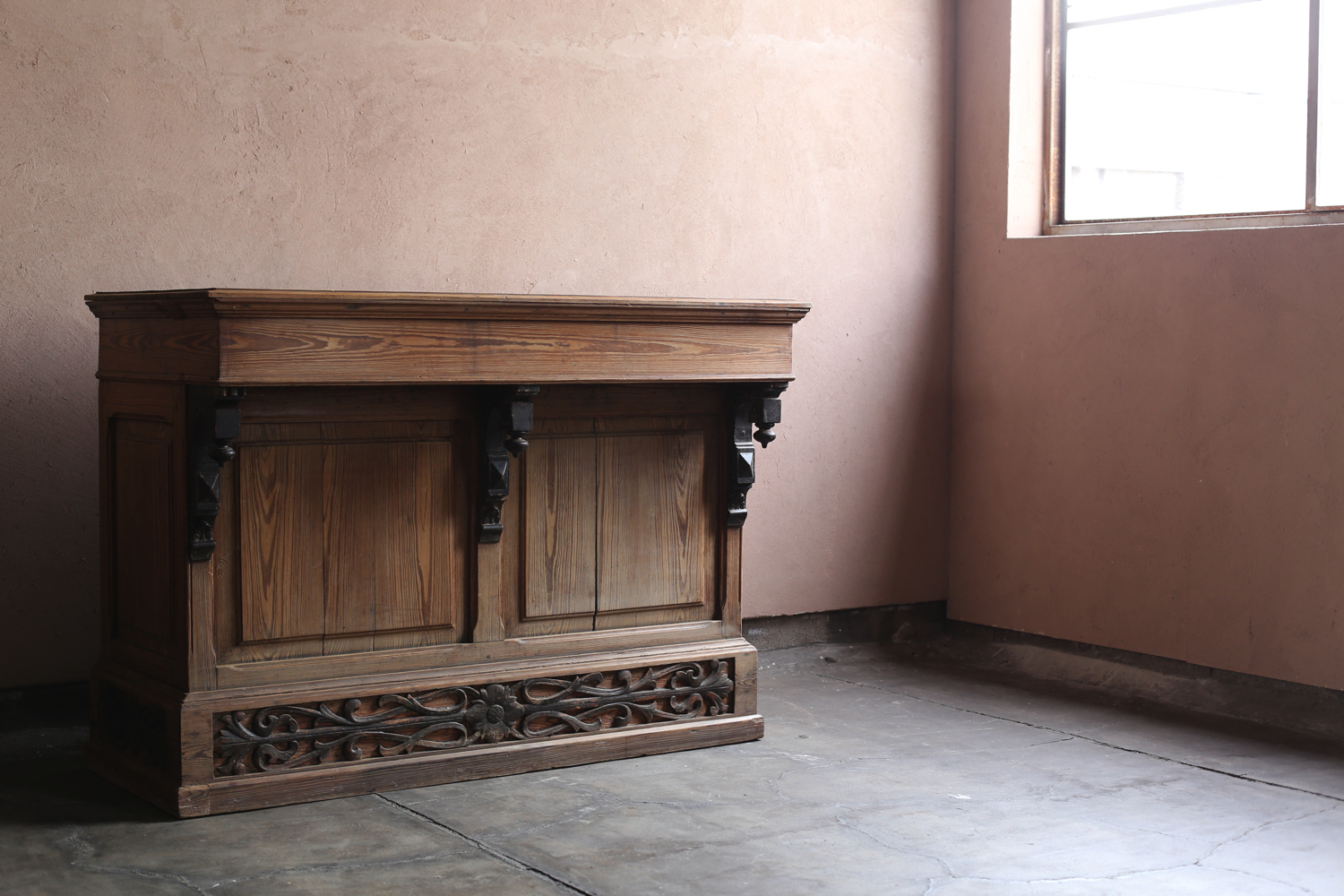 温かみある木肌に重厚な存在感を備えたフランスのアンティークカウンター。正面には力強い黒色のコンソール風装飾が施され、さらに台座部分には繊細な透かし彫りの装飾が広がり、クラシカルな趣を強調しています。背面には多数の引き出しと広い収納スペースが設けられており、店舗什器としての実用性も十分に兼ね備えた設計。