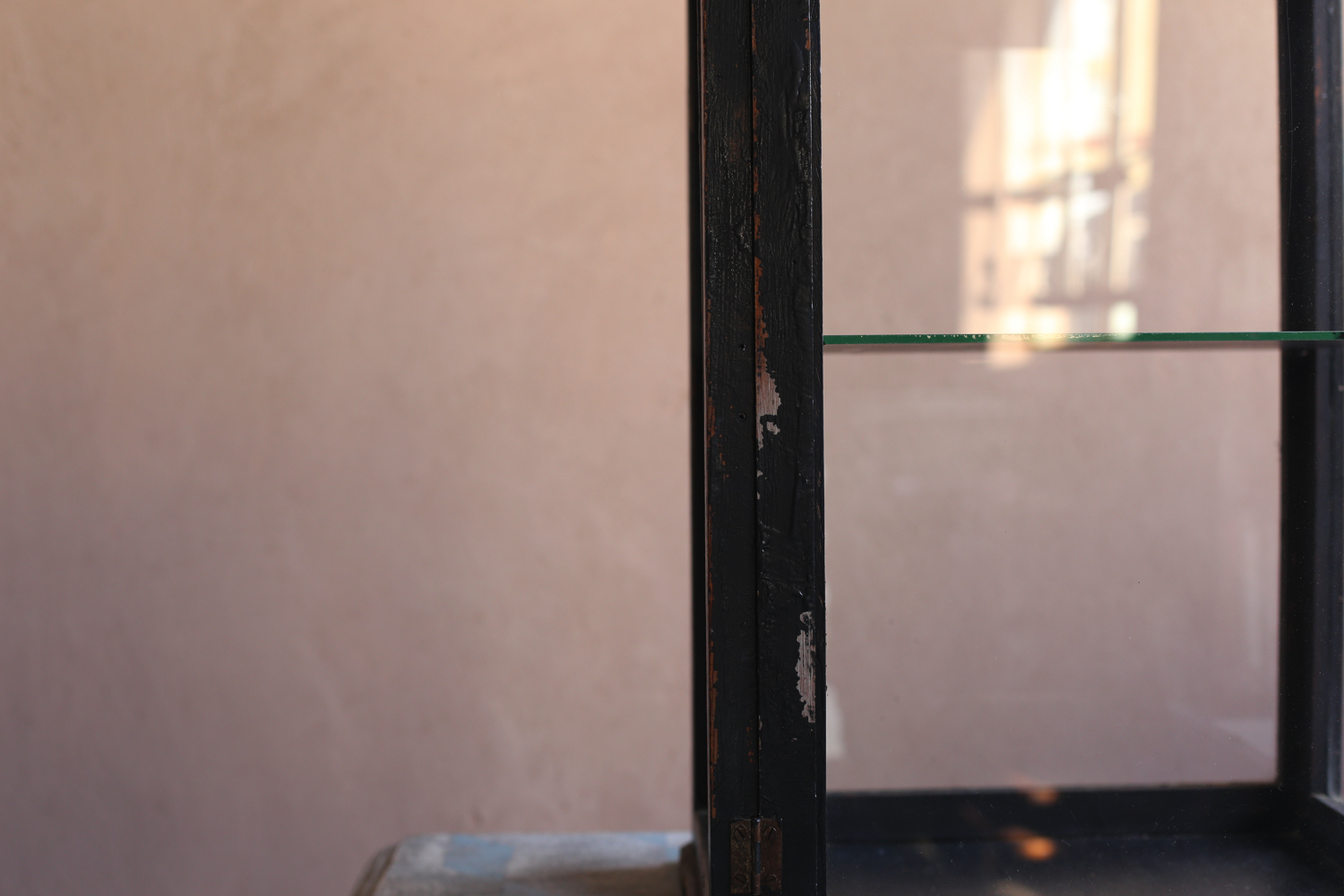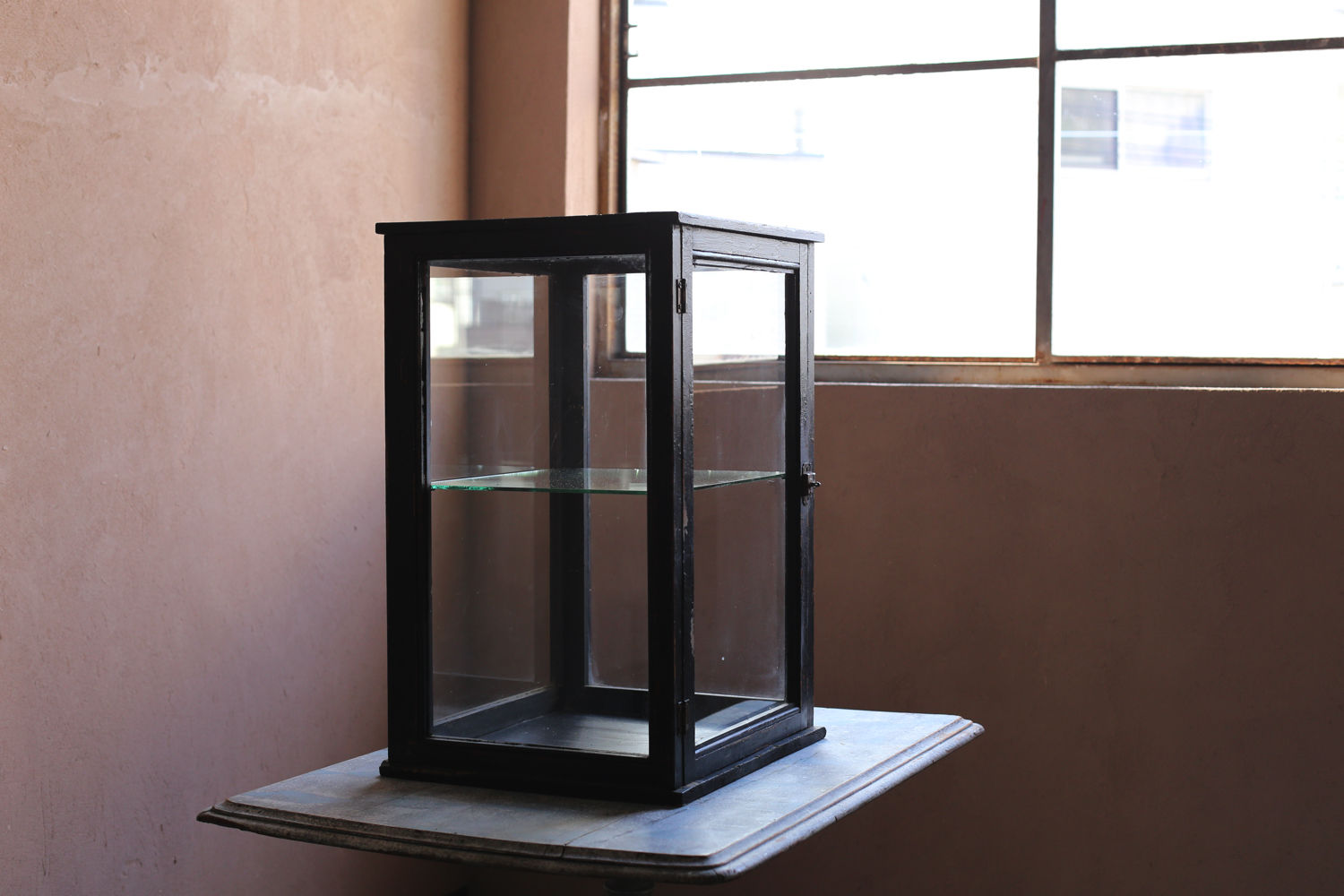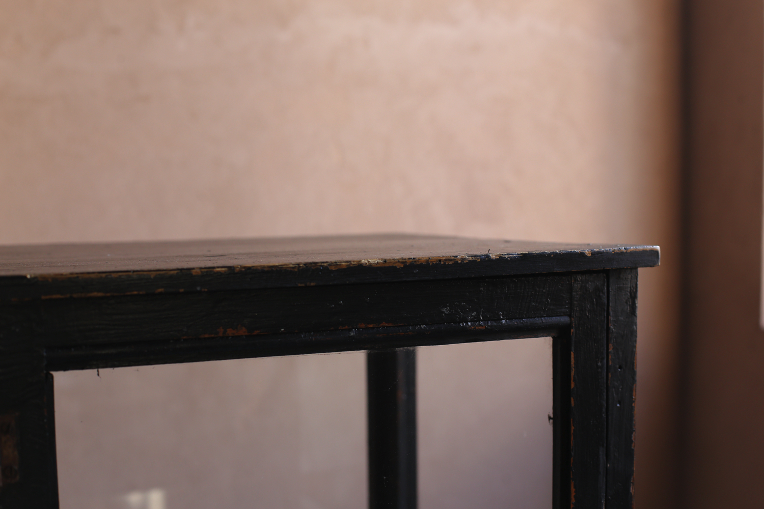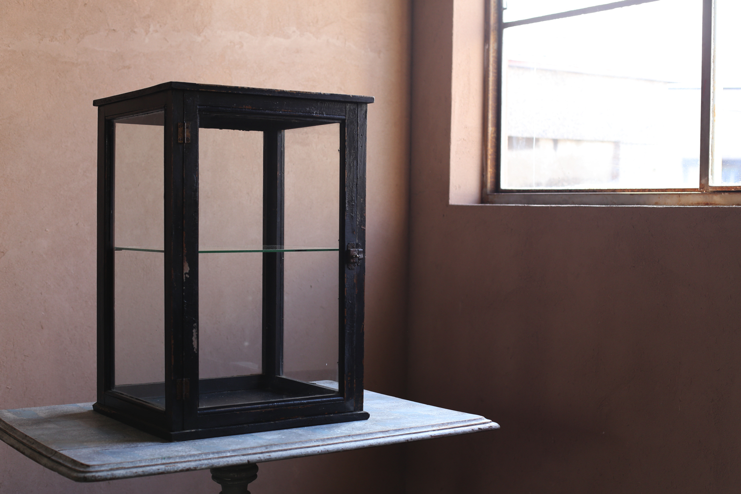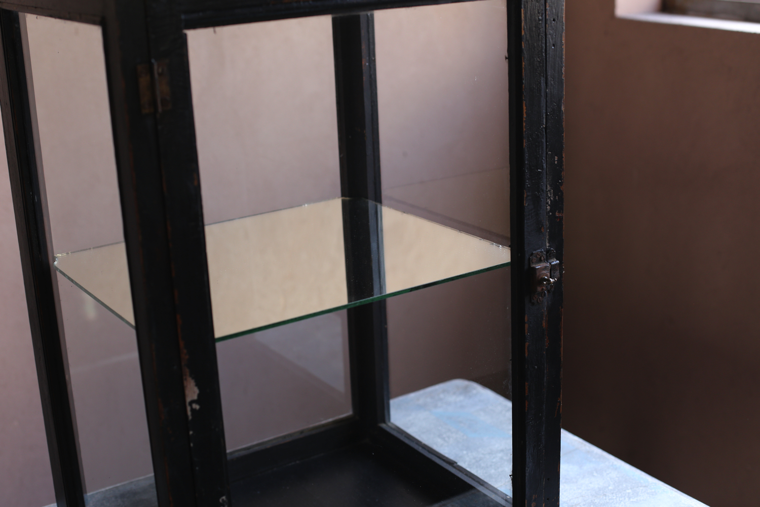 ベルギーで仕入れた黒塗りのアンティーク・ガラスショーケース。シンプルな木製フレームにガラスを組み込み、内部には一段のミラー棚を備えています。ミラーは古い風合いを残しており美しいです。ディスプレイ用として商店や薬局、工房などで用いられたと考えられる実用家具で、黒いペイントは長い年月を経て落ち着いた風合いを纏い、味わい深い存在感を放ちます。コンパクトながらも重厚感があり、時代を超えてコレクションやオブジェの展示に適した一品です。