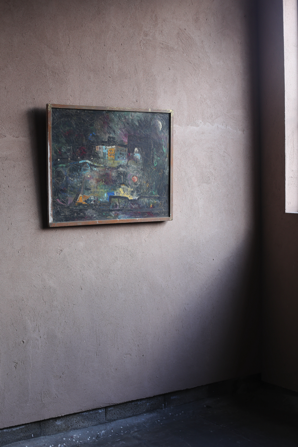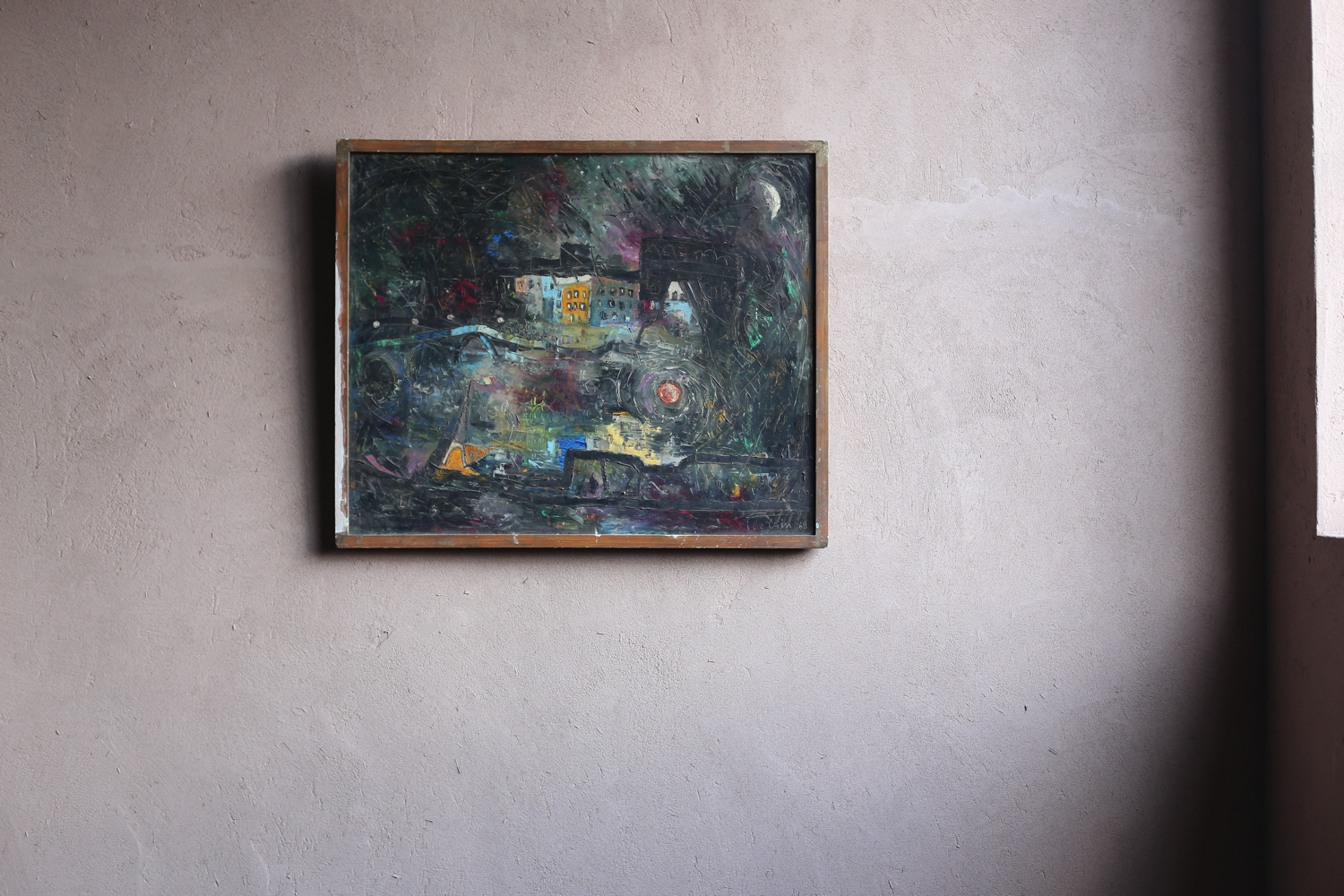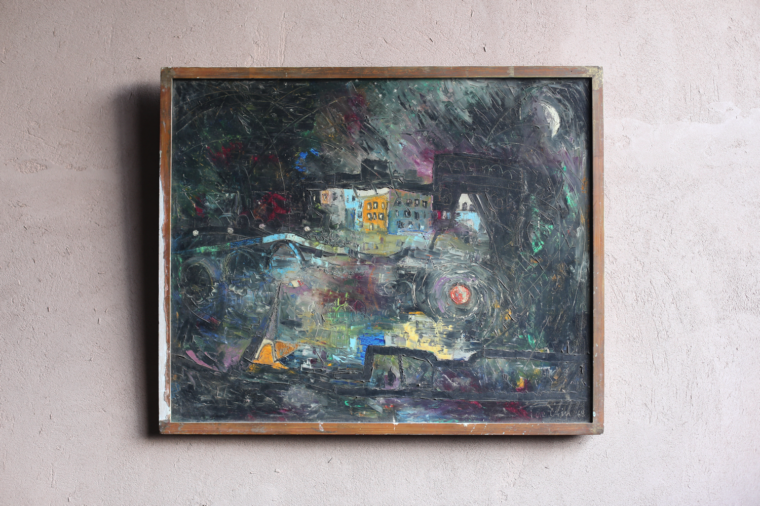 夜の都市風景を、厚塗りのマチエールと重層的な色彩で描き出している。闇に浮かび上がる建物、渦巻くような光の表現、そして大胆に引かれたスクラッチ跡が、都市の記憶や不安定な時代精神を象徴している。裏面には作家の住所表記が残され、制作当時の文脈を伝えている。