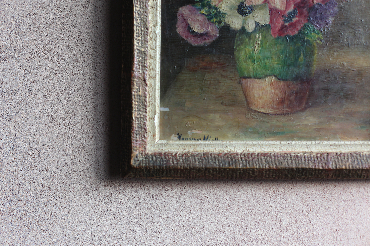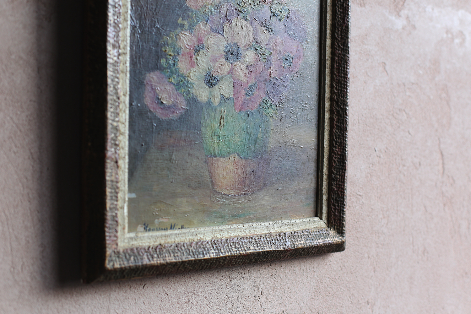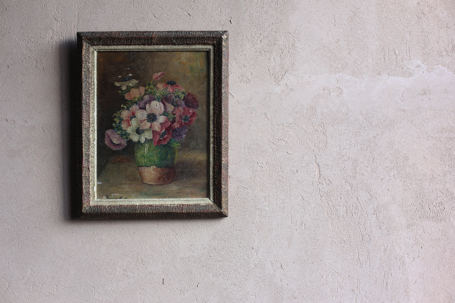 素朴なグリーンの花器に生けられたアネモネが、淡い背景の中で鮮やかな存在感を放ちます。赤・紫・白の花々がキャンバス上で織りなす調和は、印象派以降の柔らかな筆致と光の感覚を感じさせ、室内に温もりと詩情を添える一枚です。古い木製フレームに収められ、絵そのものの経年の風合いが一層魅力を引き立てています。