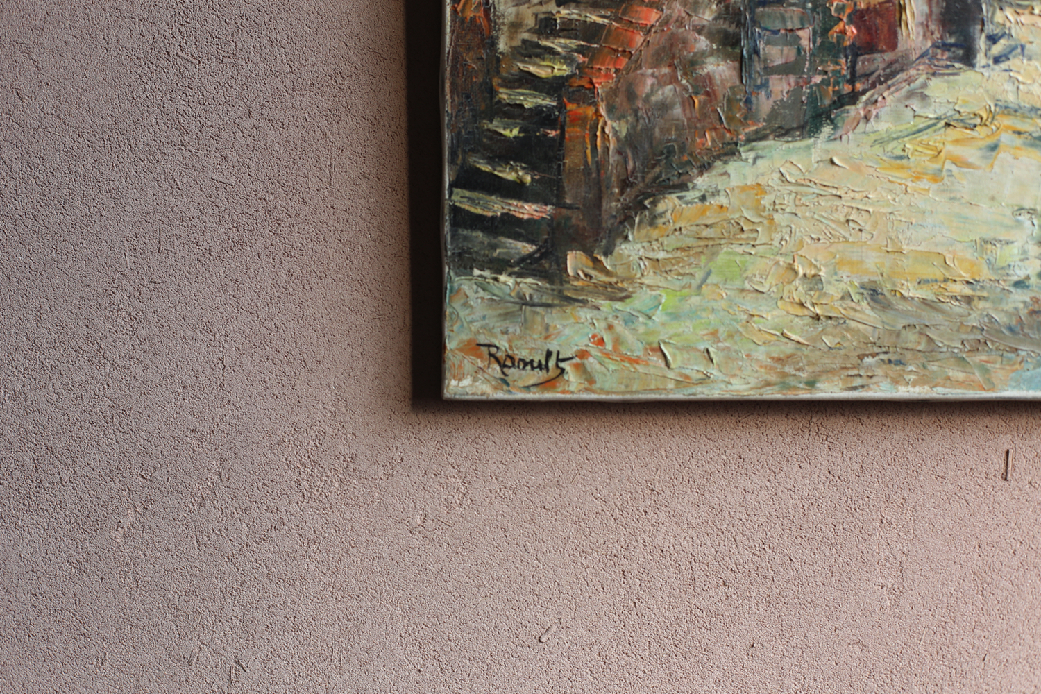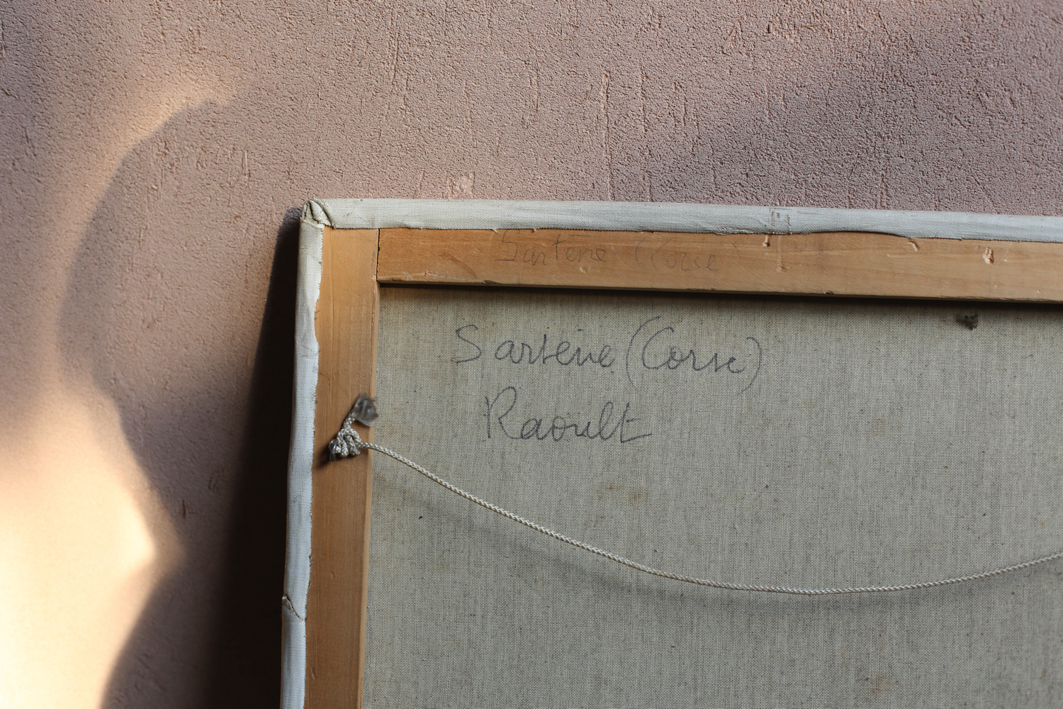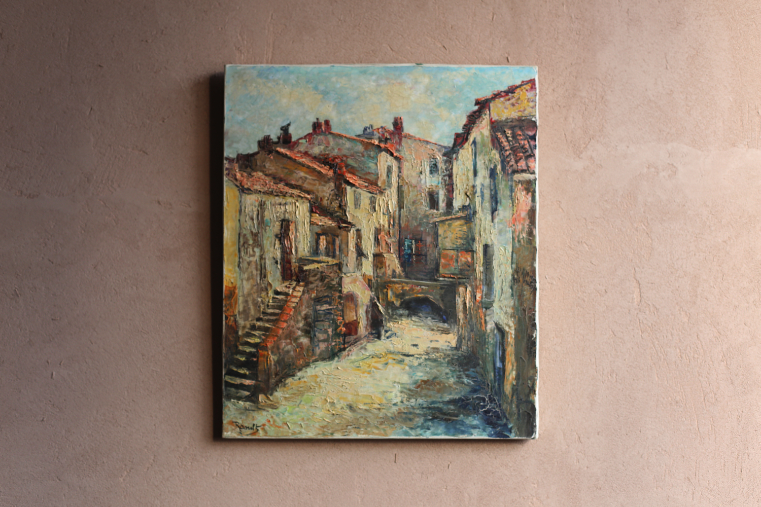 作家Raoultによる筆致は厚塗りのマチエールが特徴で、石造りの家々や赤茶の屋根、階段やアーチのある街並みを生き生きと表現しています。強い日差しが投げかける陰影や壁面の質感は、地中海的な光と歴史の重なりを感じさせます。裏面にも「Sartène (Corse)」の記載があり、場所の特定がなされています。