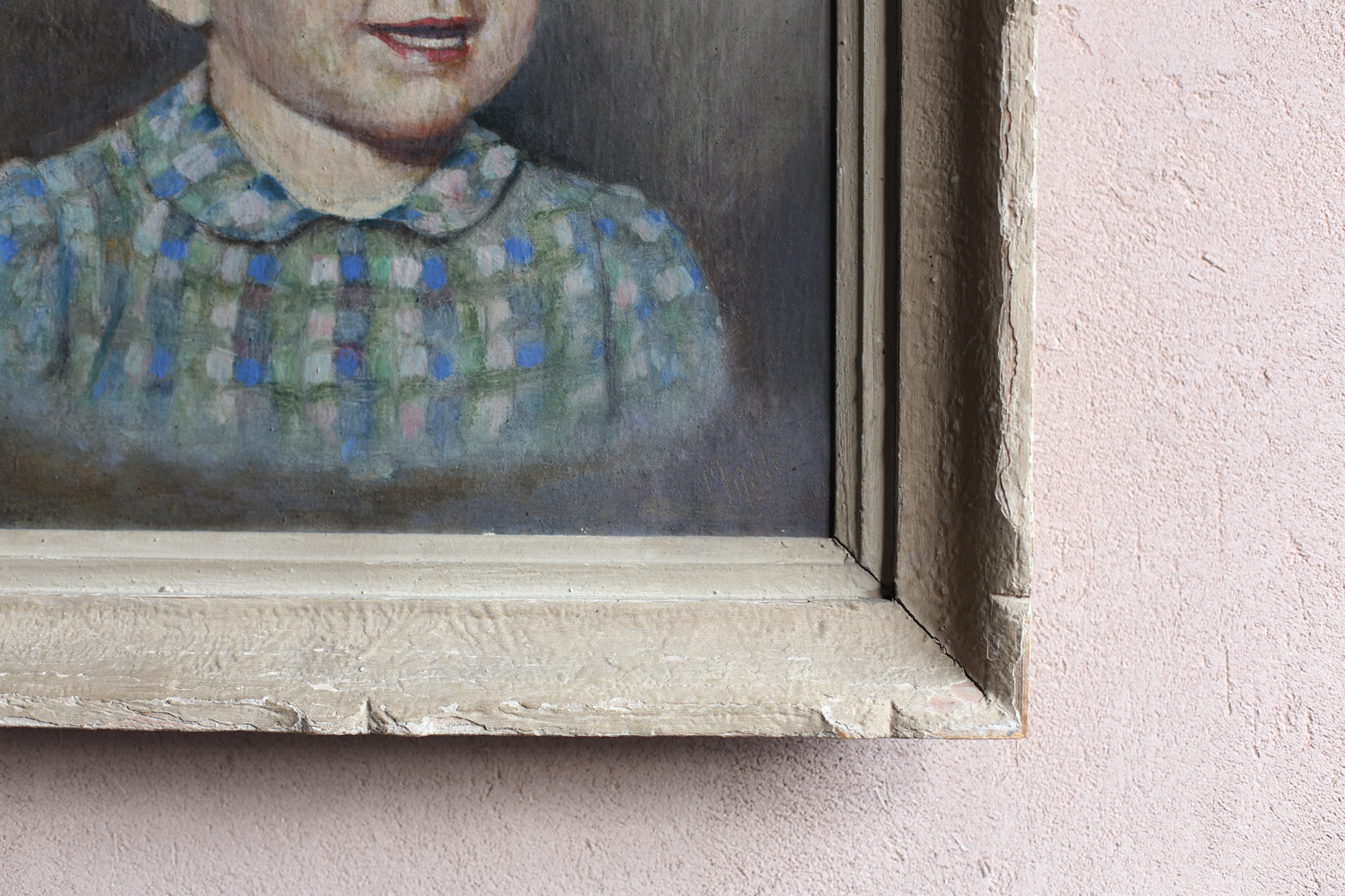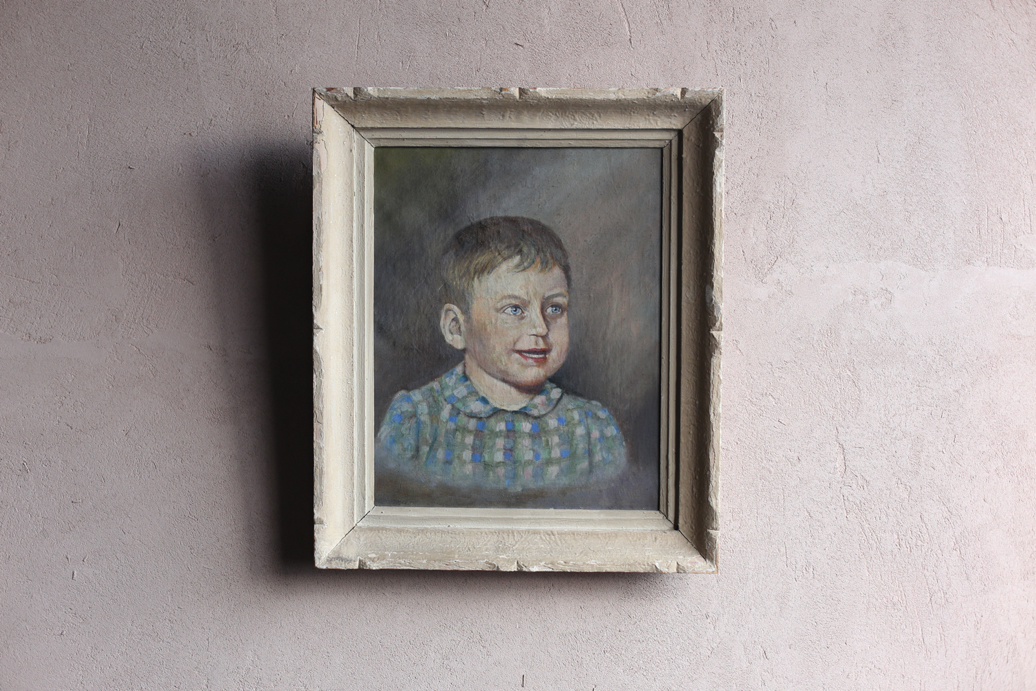 青い瞳と微笑みをたたえた表情は、当時の家族愛や記念的な意味合いを感じさせます。衣服に見られるチェック柄の丁寧な筆致や、背景の淡いグラデーションからは、肖像画としてのリアリティと温かさを両立させようとした画家の意図が読み取れます。素朴ながらも表情豊かな描写は、アマチュアあるいは地方画家による家庭的な作品であった可能性が高く、ヨーロッパの古い邸宅や家族の居間を思わせる一枚です。