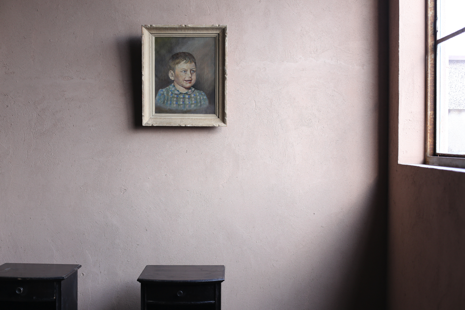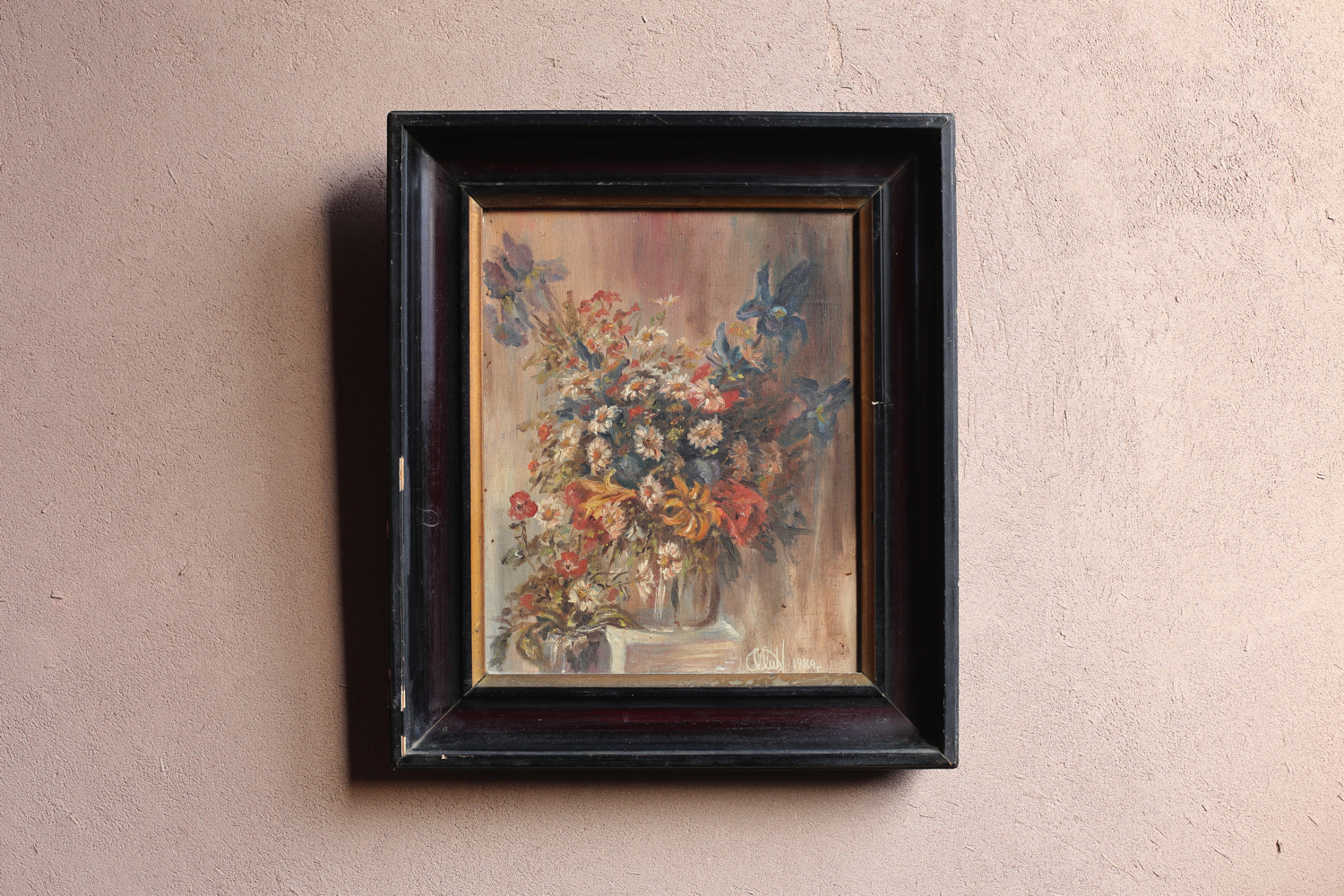 赤、橙、青の花が調和し、まるで花瓶からあふれ出すような生命感を漂わせています。サインと1984年の日付が確認でき、裏面には当時の展覧会出品や管理を示すラベルが残されており、中欧の美術展に出品された経緯もあるようです。