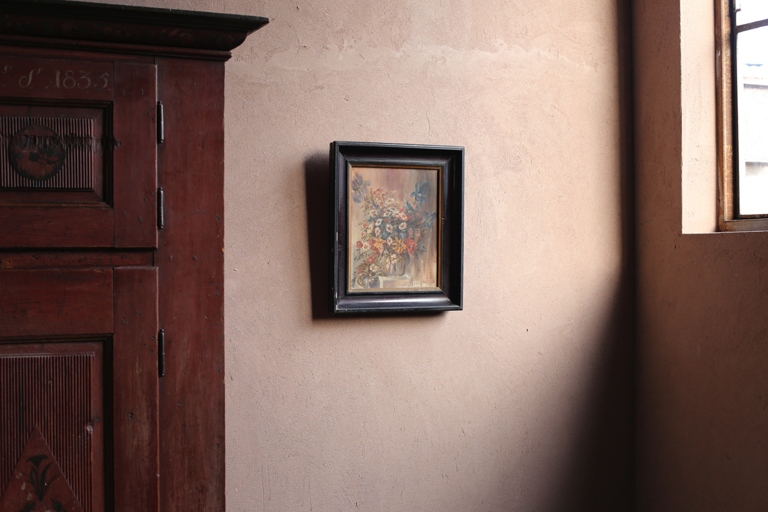 落ち着いた色調の背景に、鮮やかな花々が力強く描かれた油彩画。