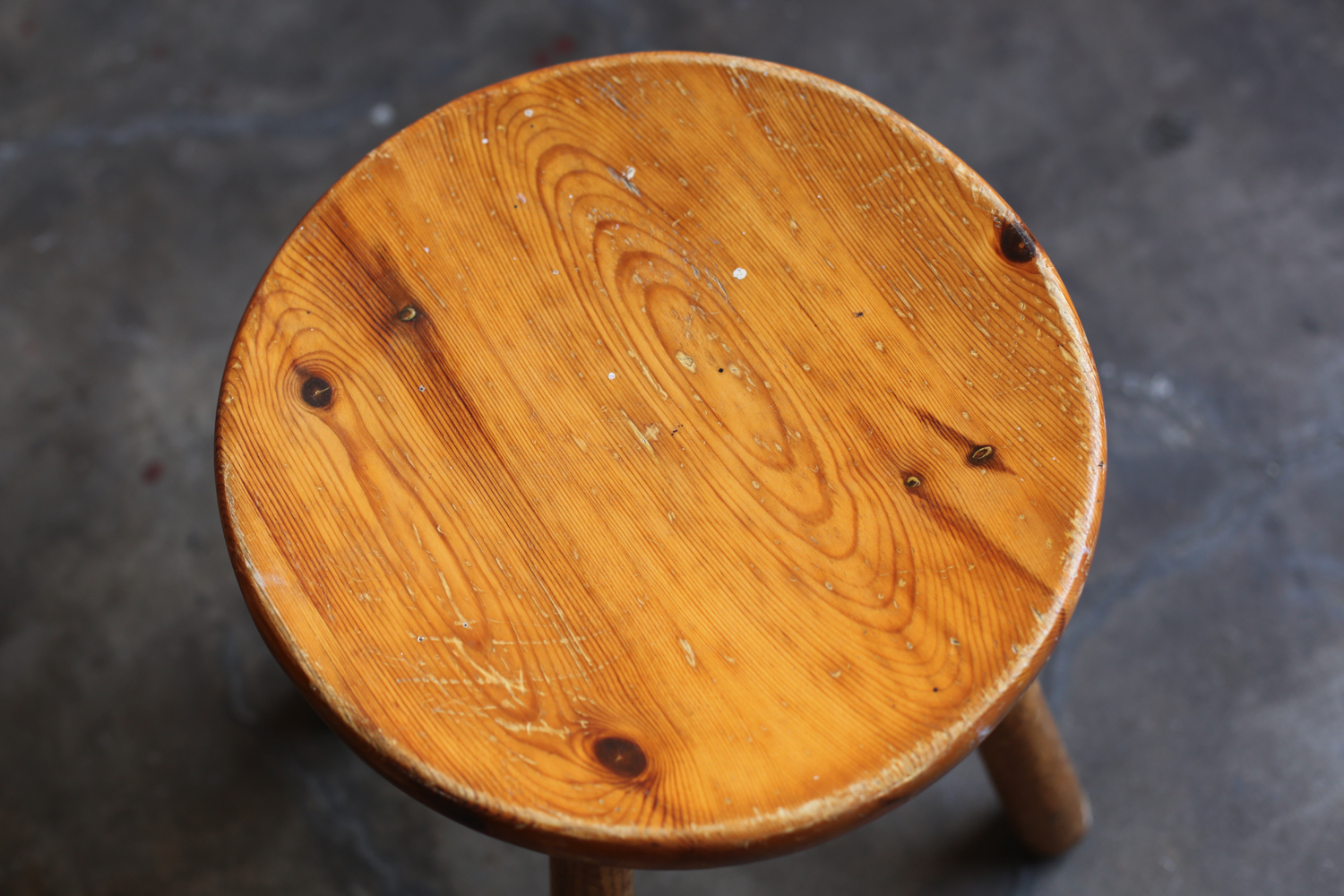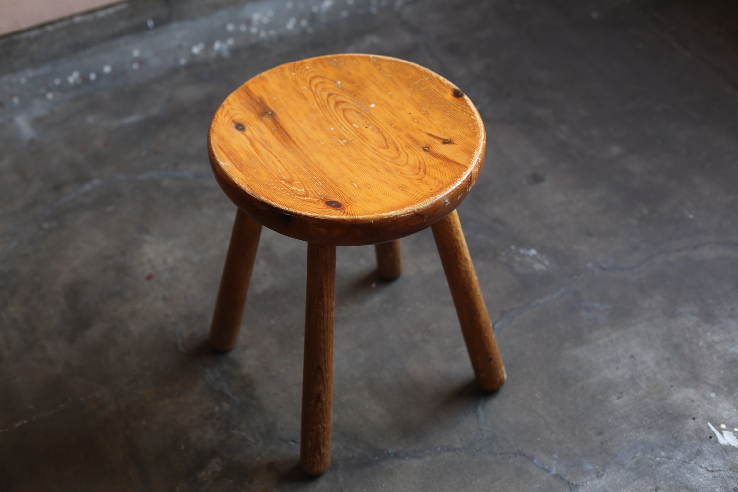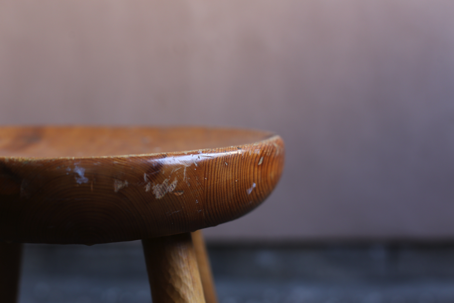 アノニマスのパインスツール。脚は彫り込まれたテクスチャーがあり、天板は側面の傾斜が丸みを帯びたデザインとなっております。経年の風合いも素晴らしいです。シンプルですが細部まで手の込んだ素敵なスツール。