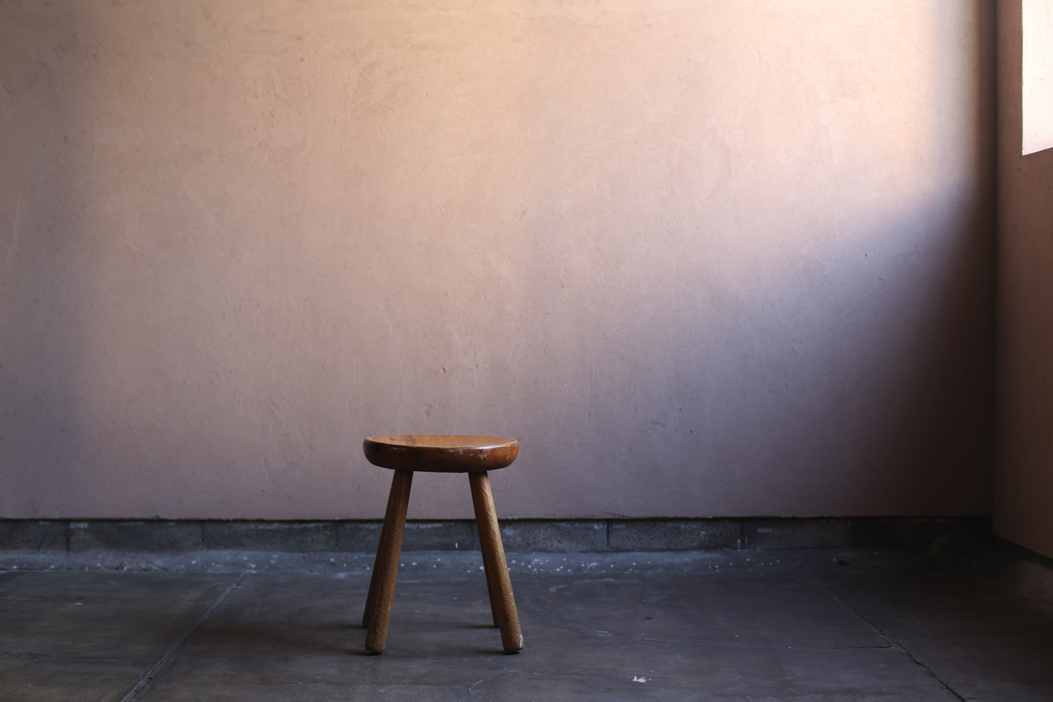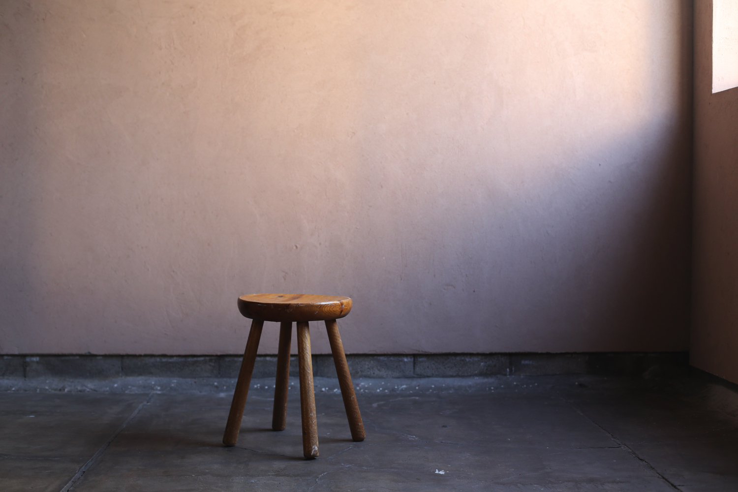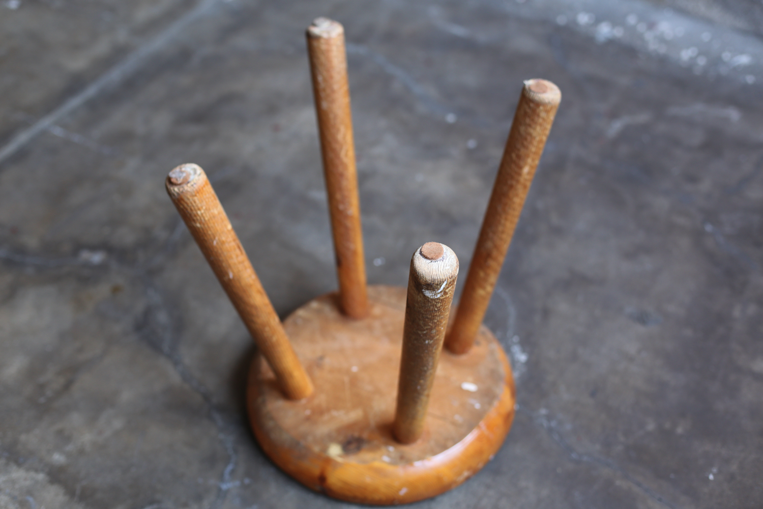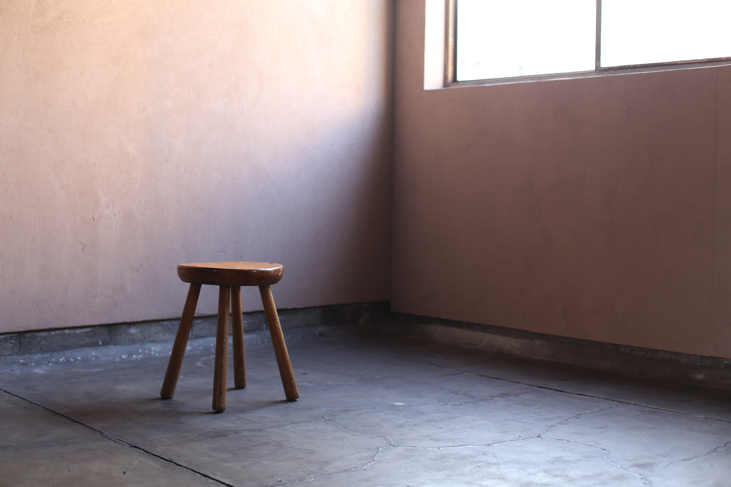 アノニマスのパインスツール。脚は彫り込まれたテクスチャーがあり、天板は側面の傾斜が丸みを帯びたデザインとなっております。経年の風合いも素晴らしいです。シンプルですが細部まで手の込んだ素敵なスツール。