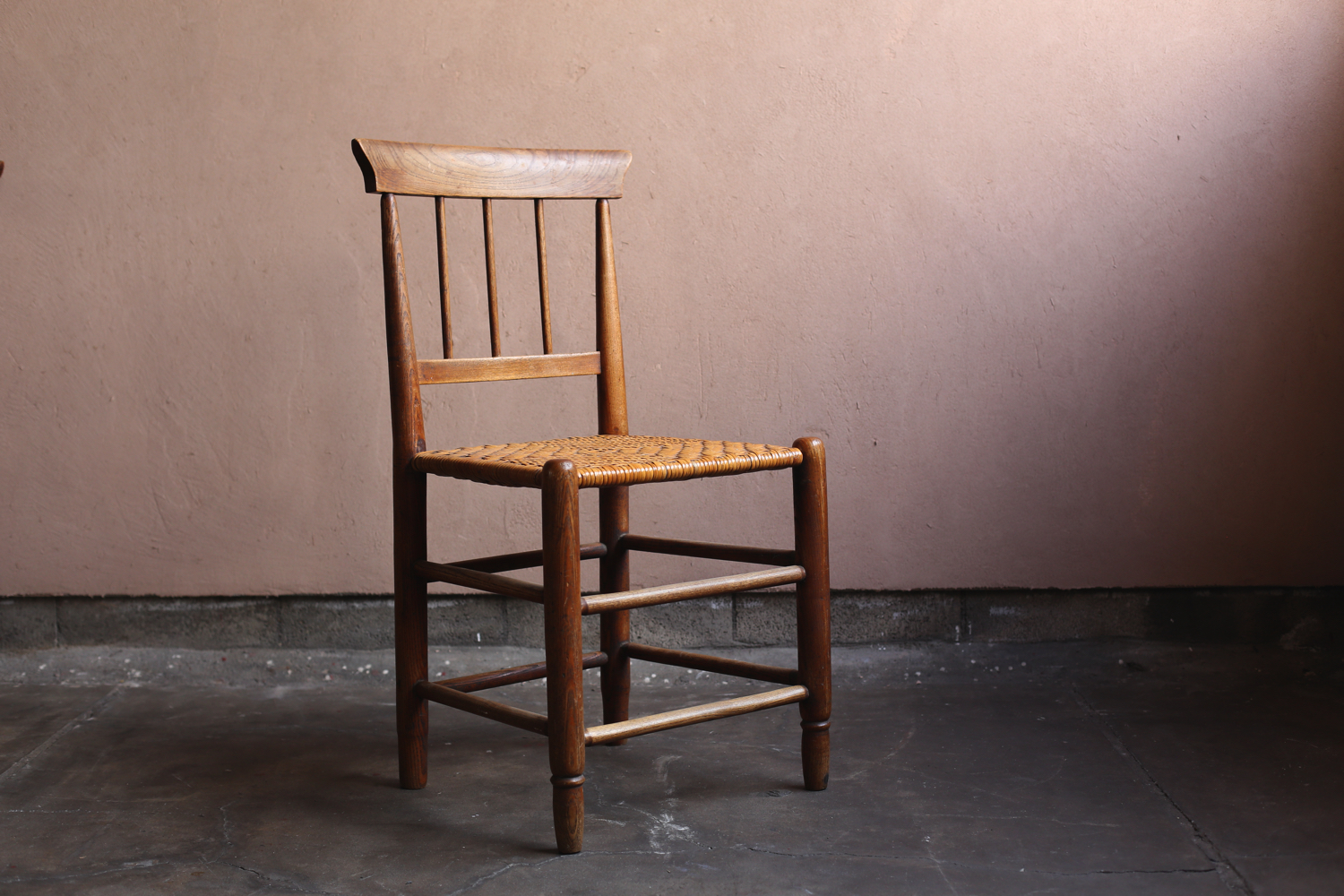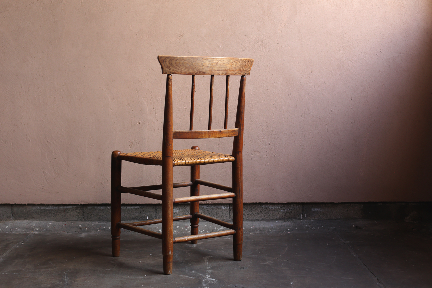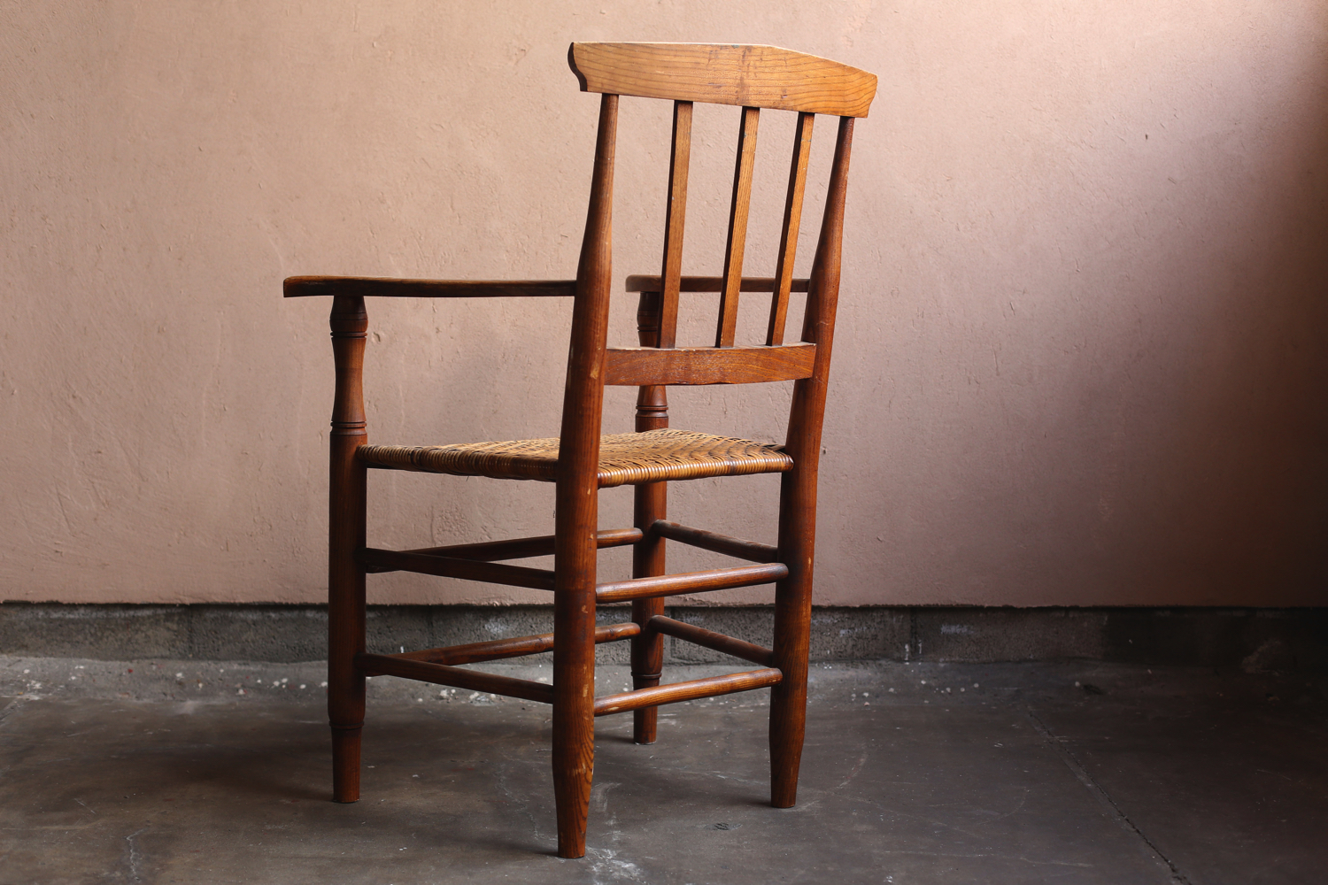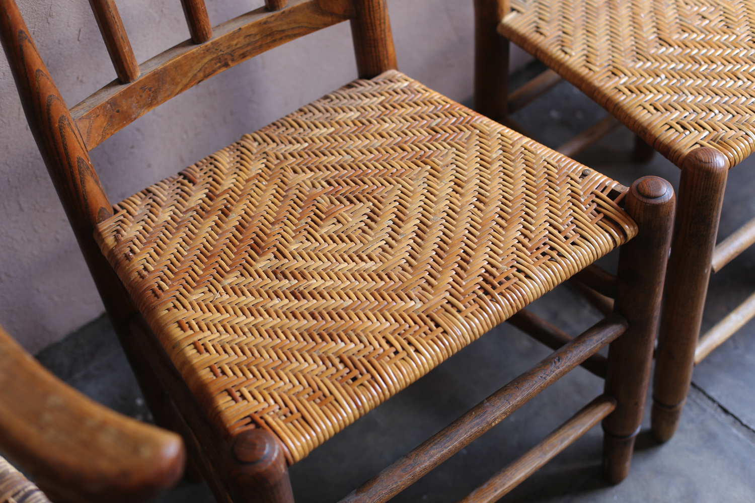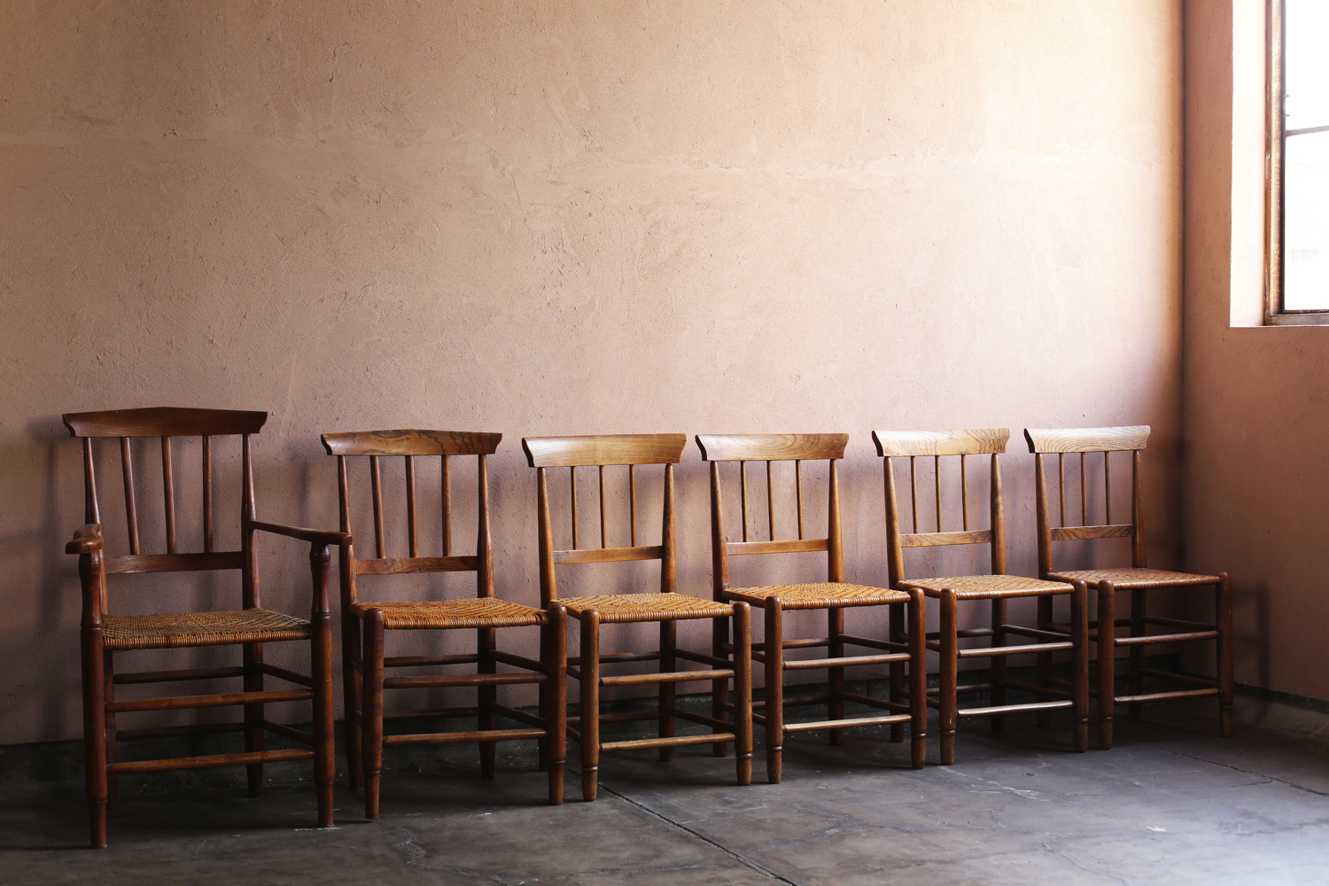 フランスの20世紀初頭のプロヴィンシャルチェア6脚セット(うち1脚はアームチェア)。無垢材の背もたれと脚部、ラッシュ(イグサ)編みの座面が特徴で、農村部の暮らしに根ざした素朴な造りを見せています。背板に配された縦桟のシンプルな意匠は軽やかさを与え、アームチェアを含む構成はダイニングセットとしても用いられていたことを物語ります。時を経た木肌と編み込みの艶やかな風合いが、フランス田園家具特有の温かみを今に伝える一組です。
