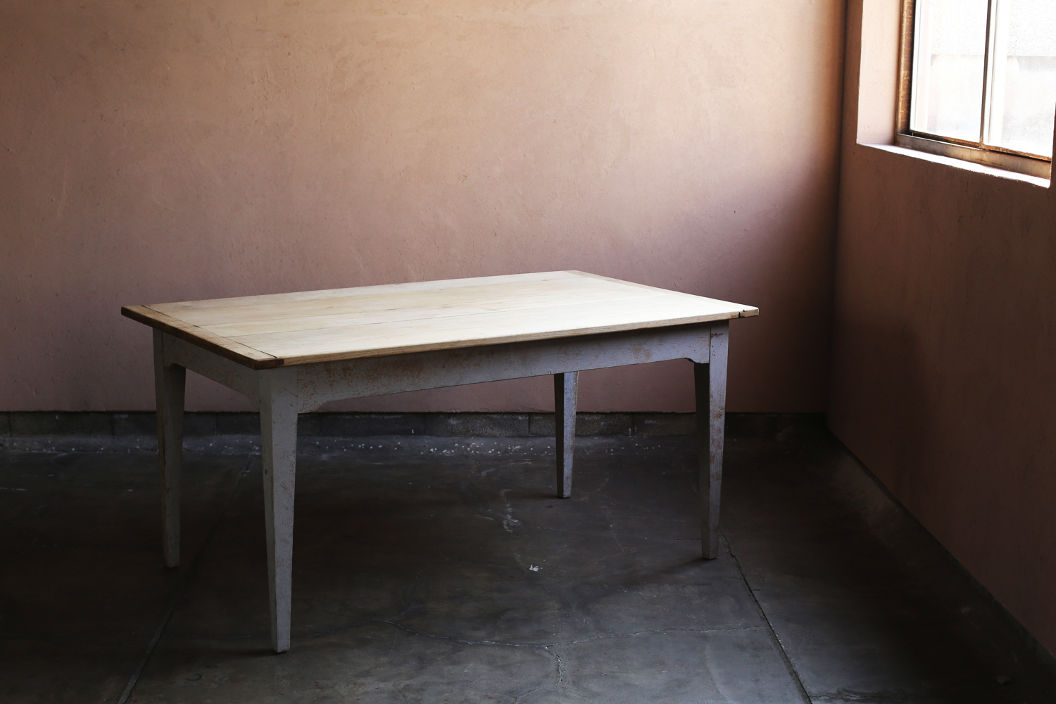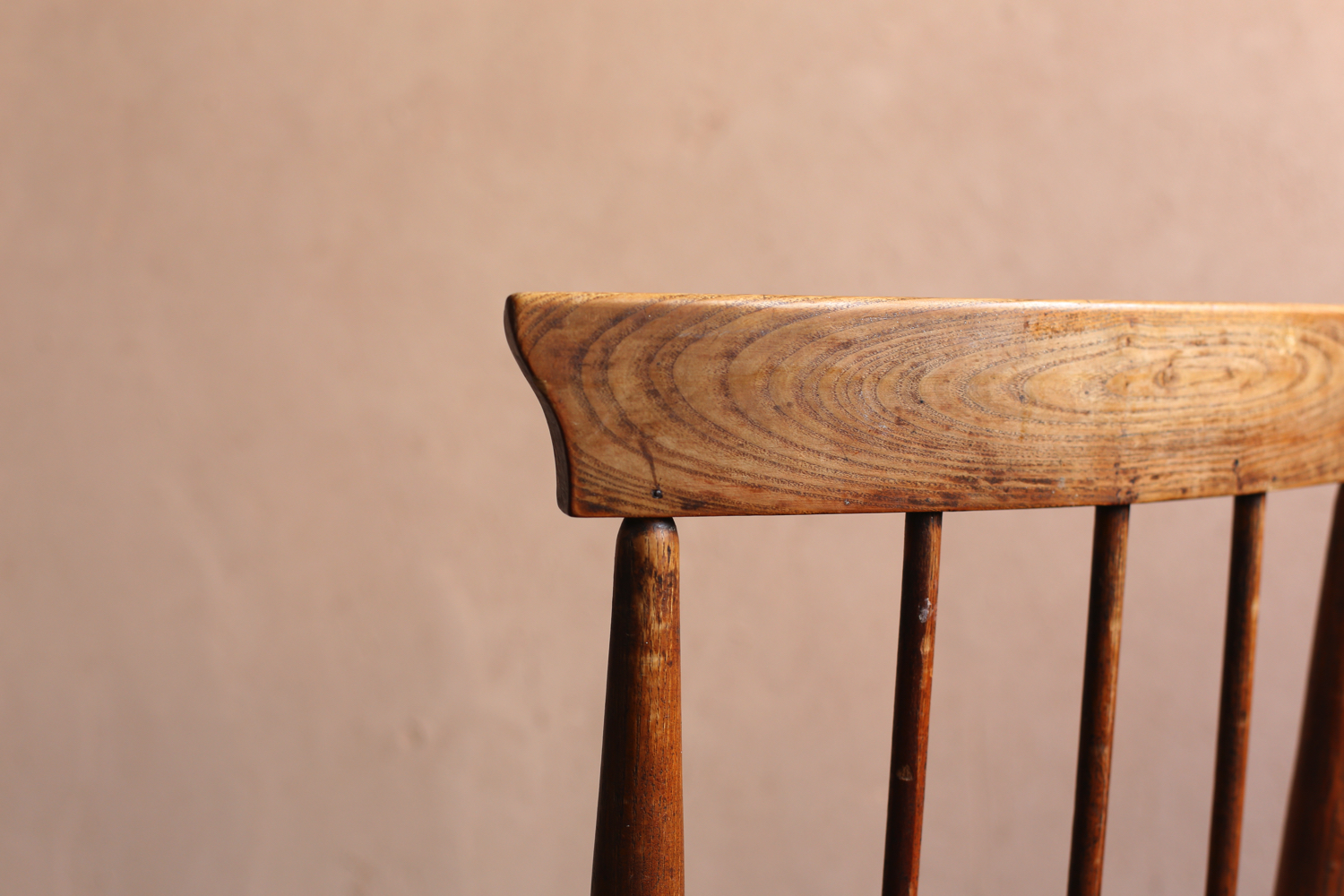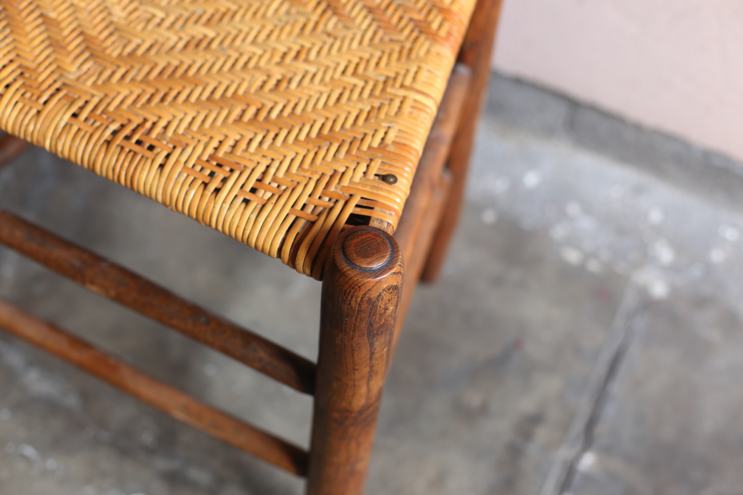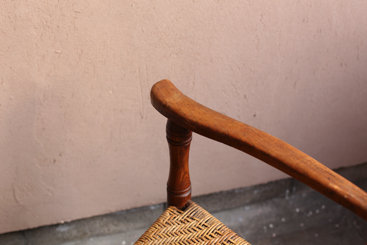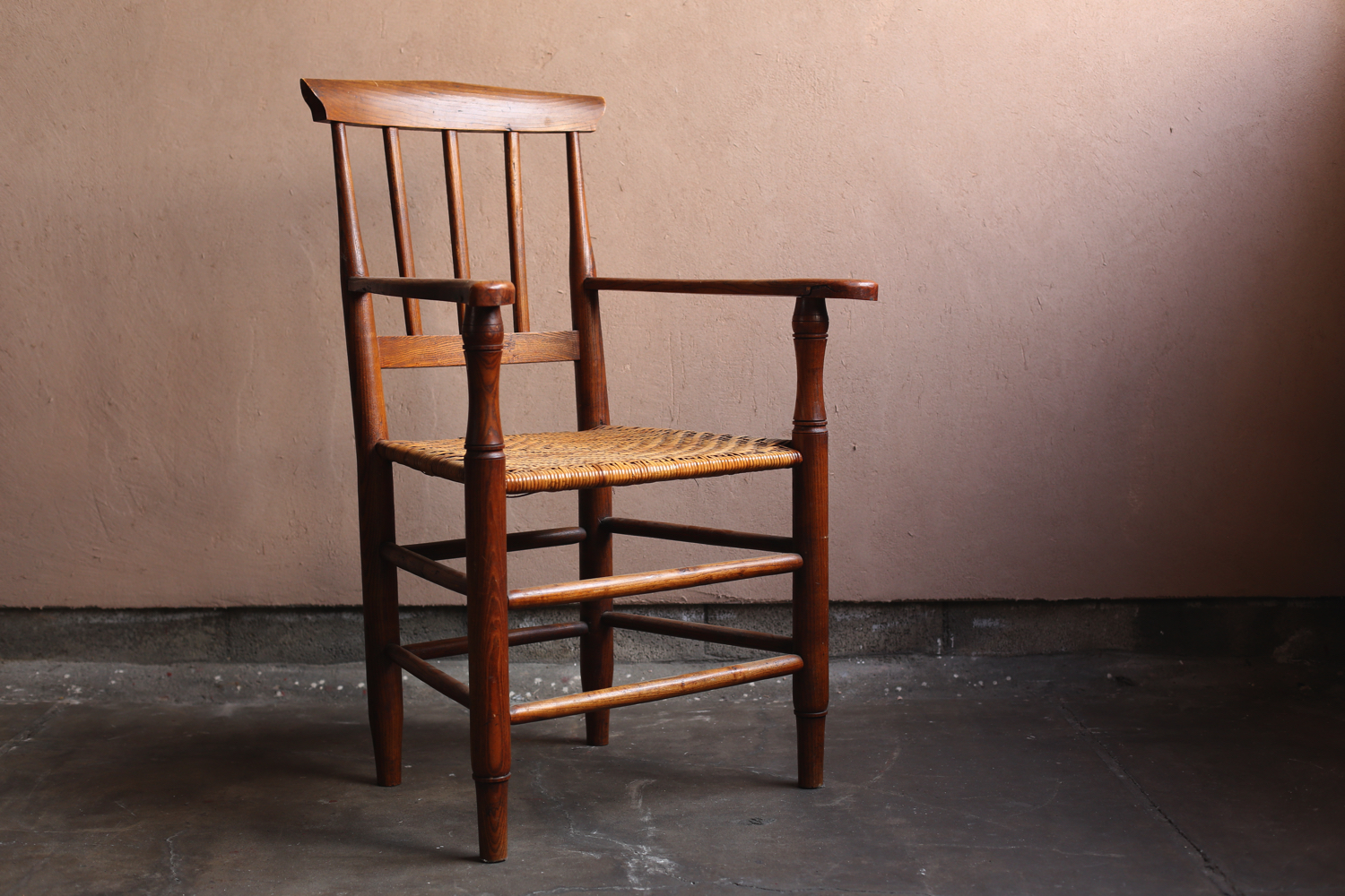 フランスの20世紀初頭のプロヴィンシャルチェア6脚セット(うち1脚はアームチェア)。無垢材の背もたれと脚部、ラッシュ(イグサ)編みの座面が特徴で、農村部の暮らしに根ざした素朴な造りを見せています。背板に配された縦桟のシンプルな意匠は軽やかさを与え、アームチェアを含む構成はダイニングセットとしても用いられていたことを物語ります。時を経た木肌と編み込みの艶やかな風合いが、フランス田園家具特有の温かみを今に伝える一組です。
