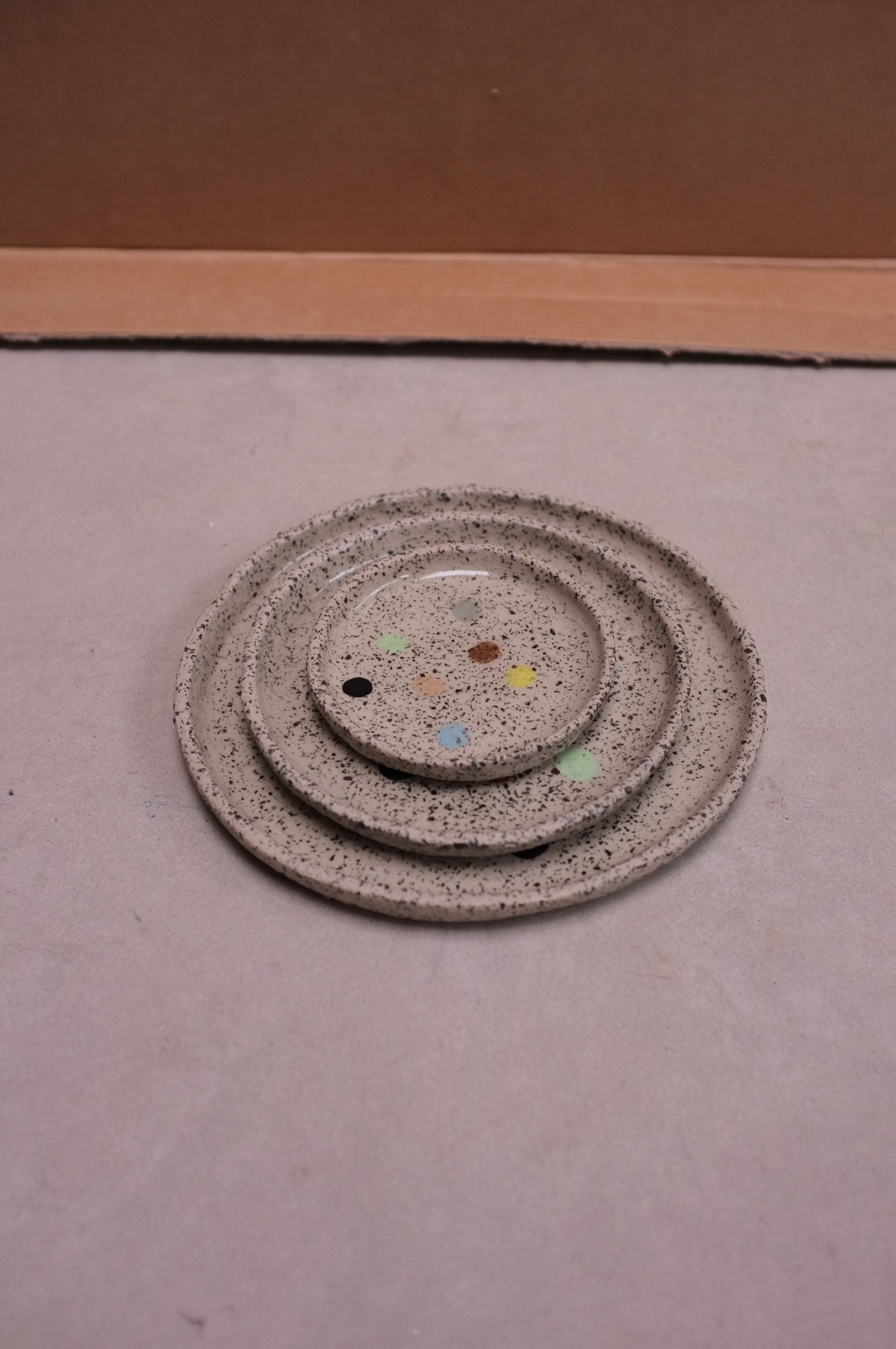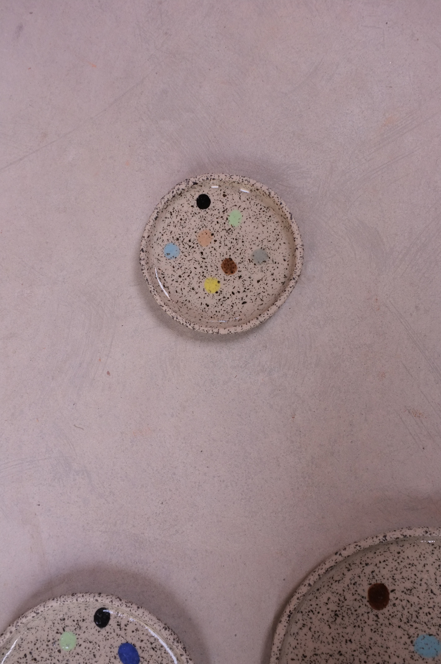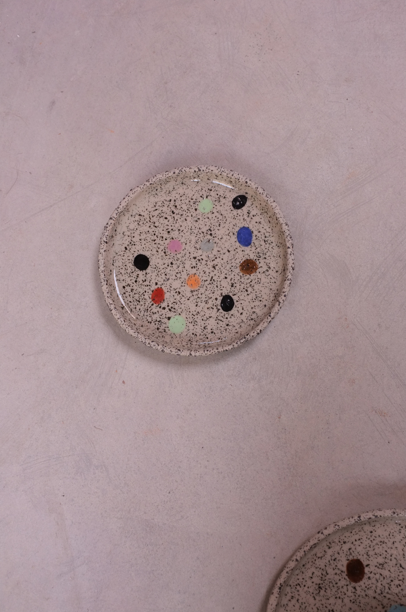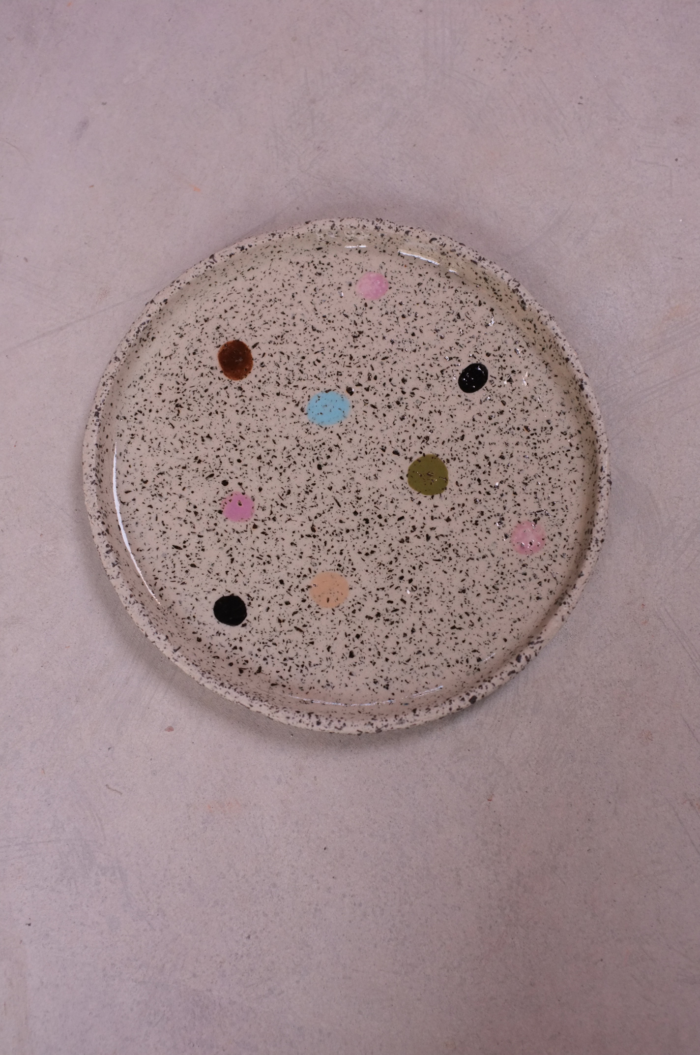 Painted Round Plate with colourful dots in Stracciatella Clay