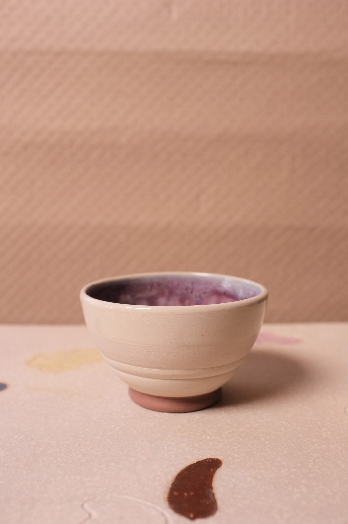 Cup in White Clay with Purple Lavender + Sheer Glaze and Brown foot