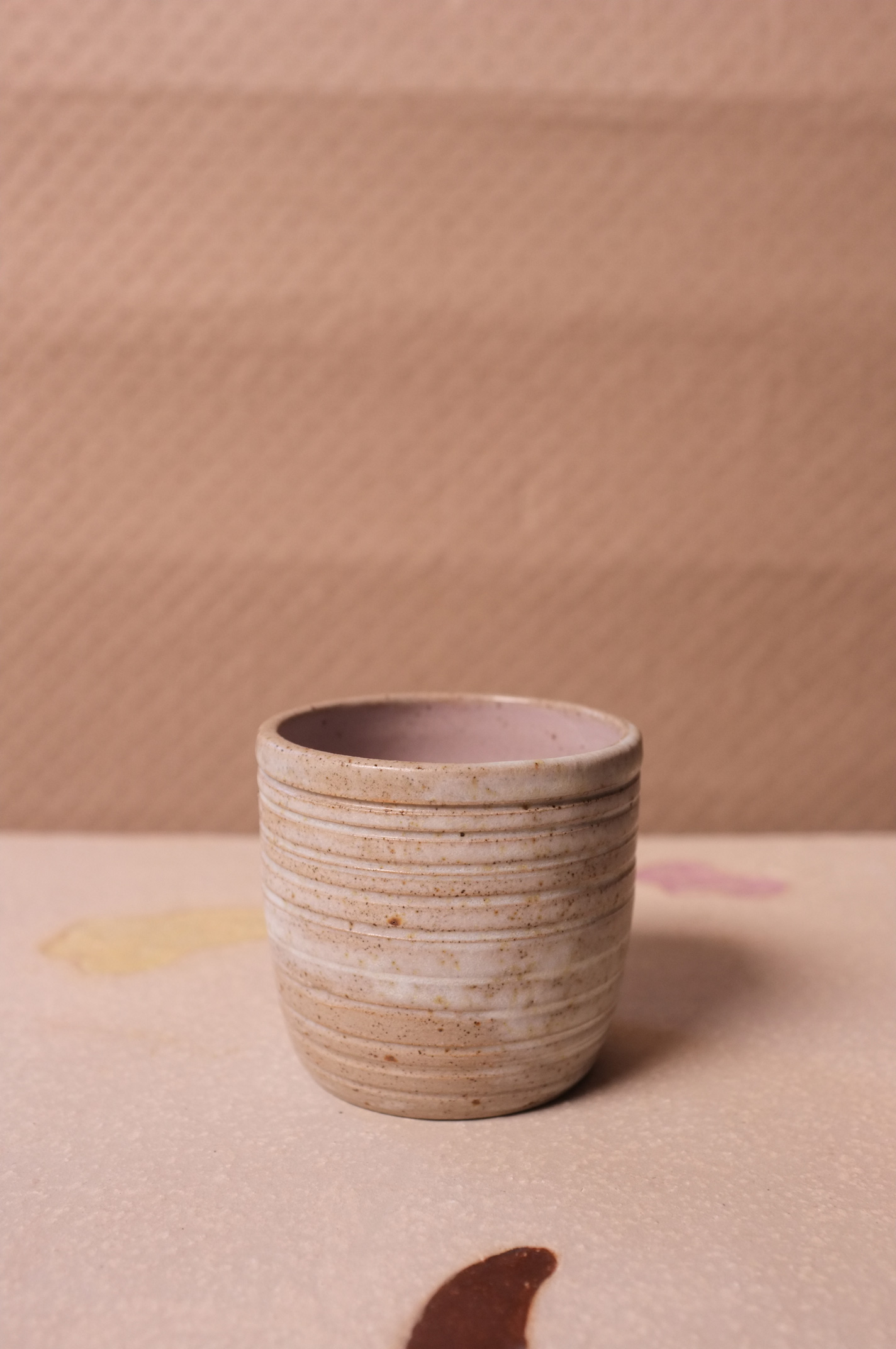 Cup in Grey Speckled Clay with White Speckled Glaze (has a meandering line carving) Cup in White Clay with Satin Mauve + Sheer Glaze