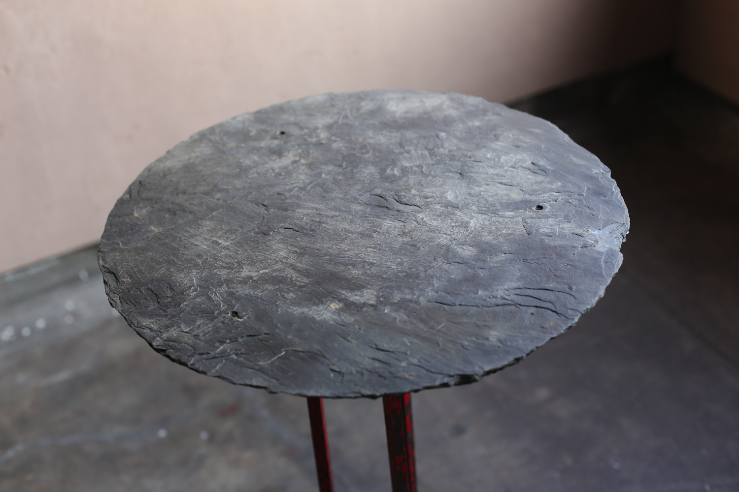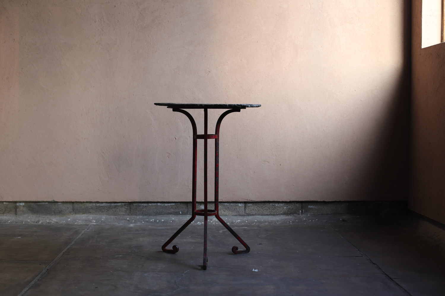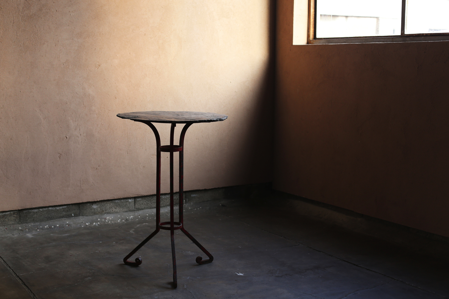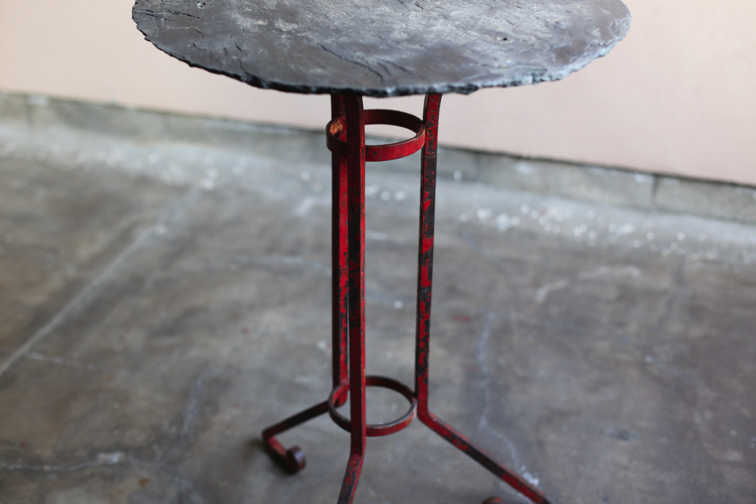 ポルトガルで制作されたアンティークのスレートテーブル。堅牢なスレート石の天板と、手仕事で鍛造されたアイアンベースが組み合わされ、素朴でありながらも力強い佇まいを見せます。