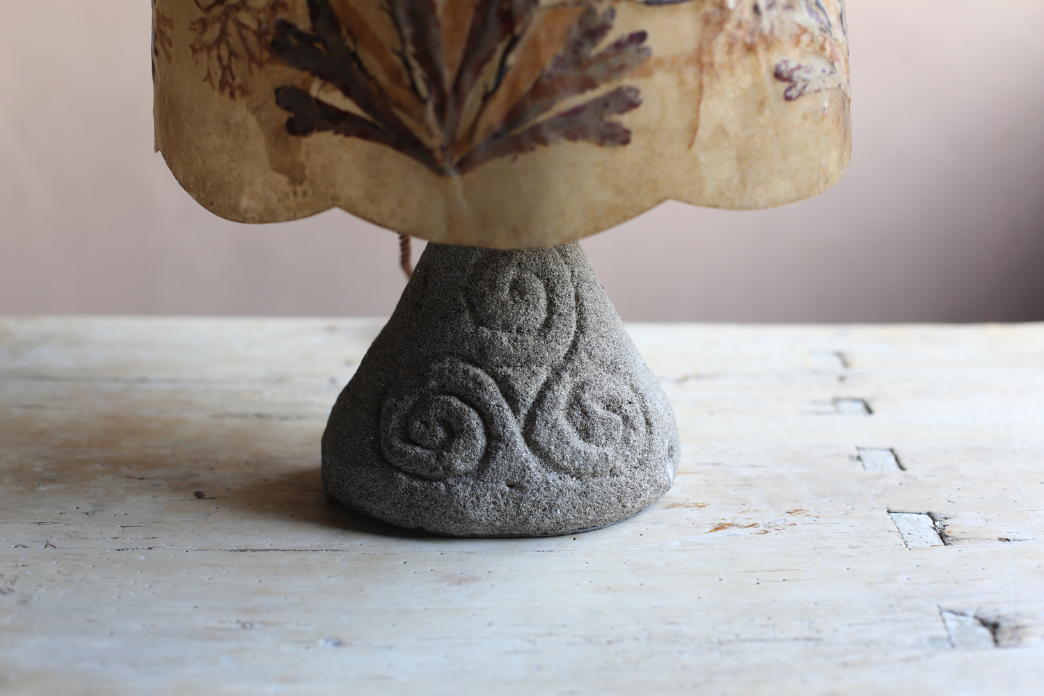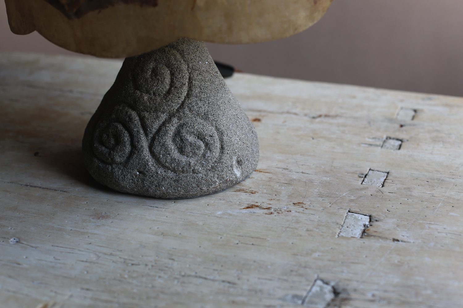 石を削り出したような質感のベースには、渦を描く装飾的なレリーフが刻まれ、
