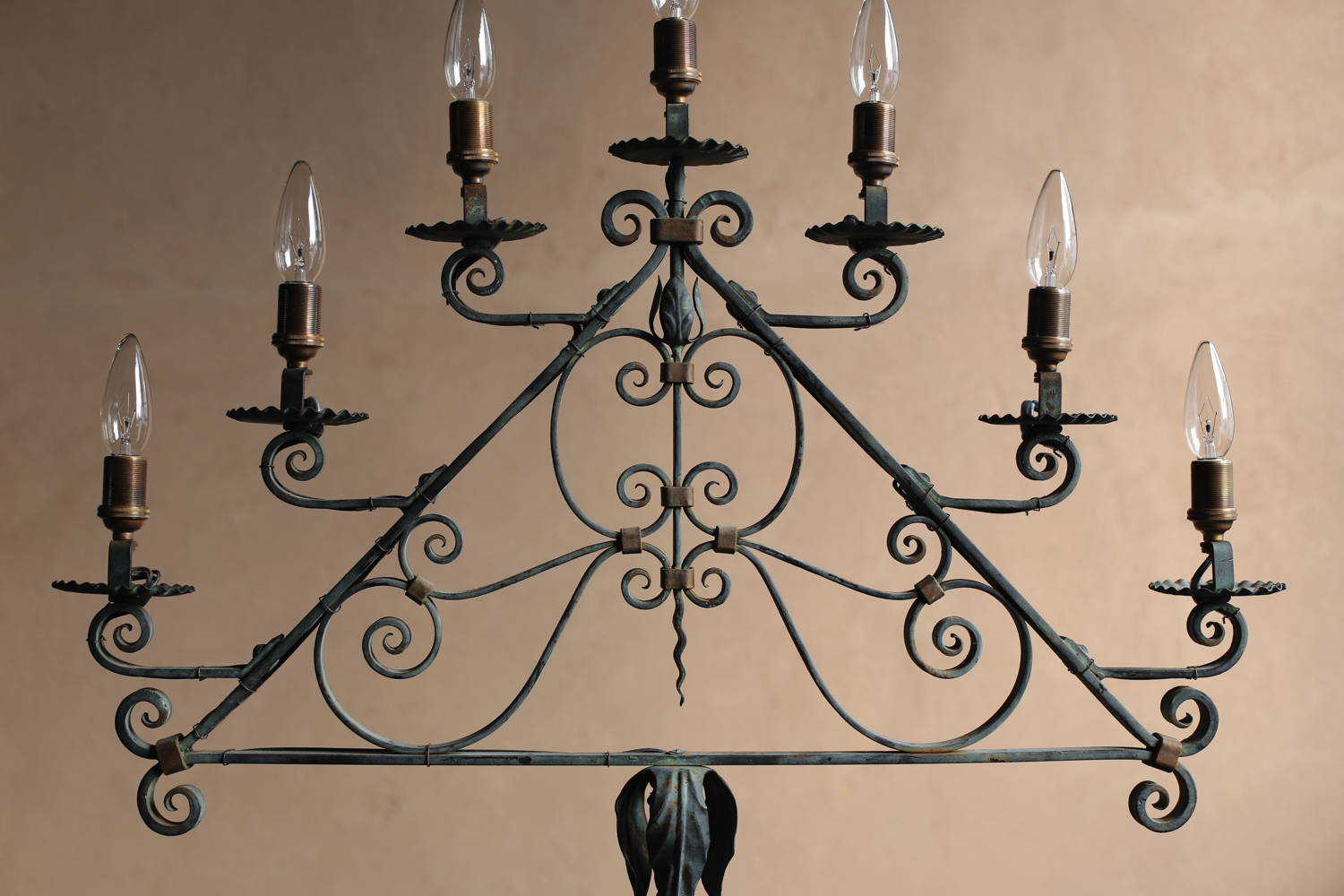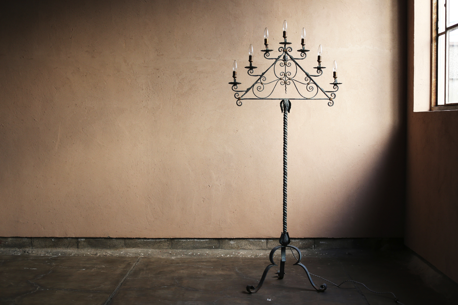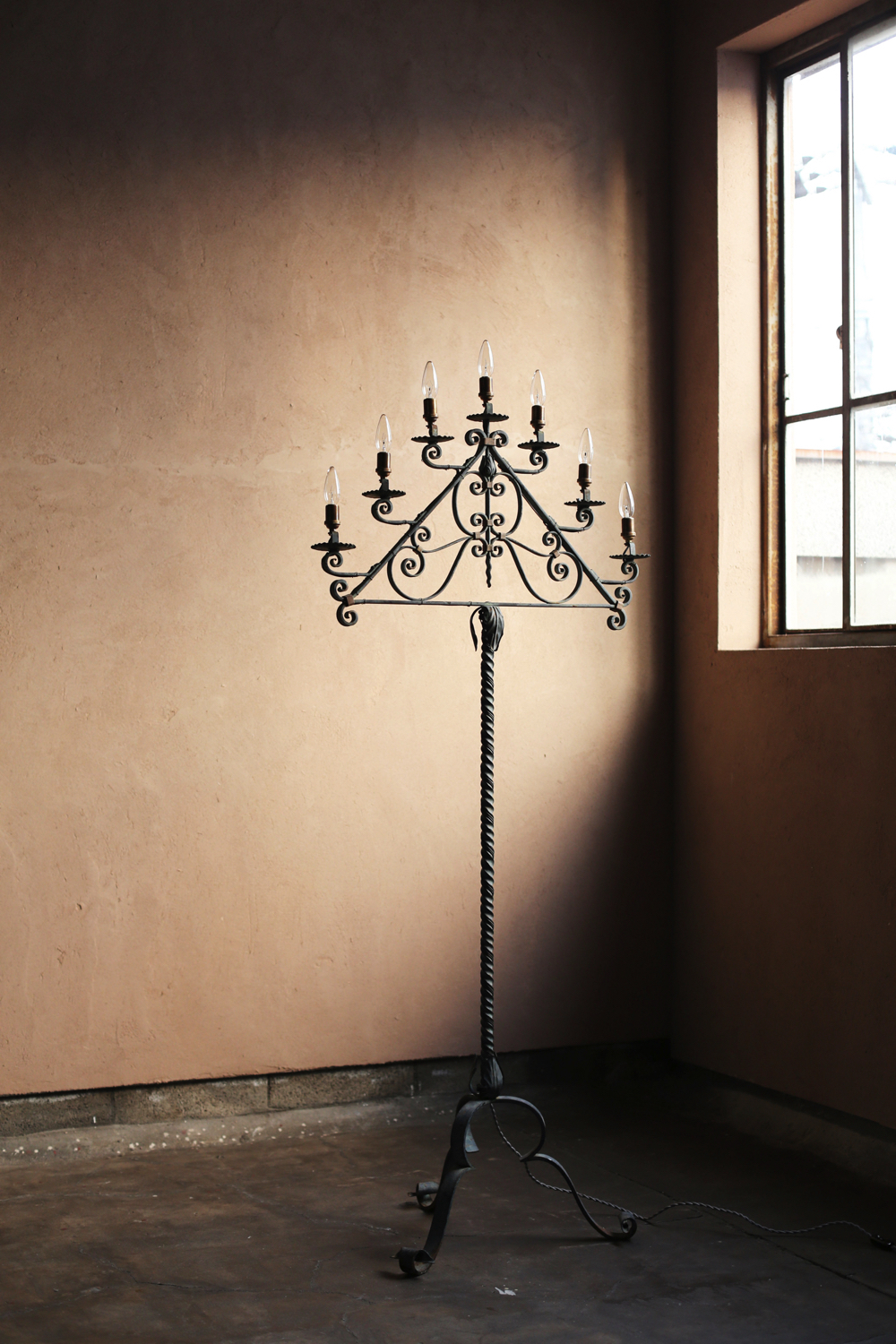 三脚のベースから立ち上がる支柱は螺旋状にねじられ、上部の三角形のフレームには計七灯の照明を配した構成。