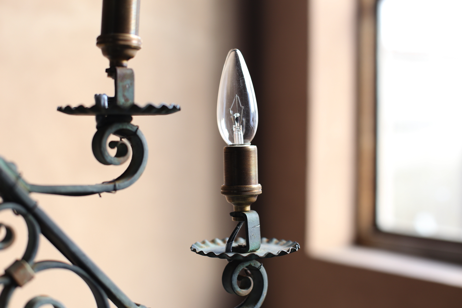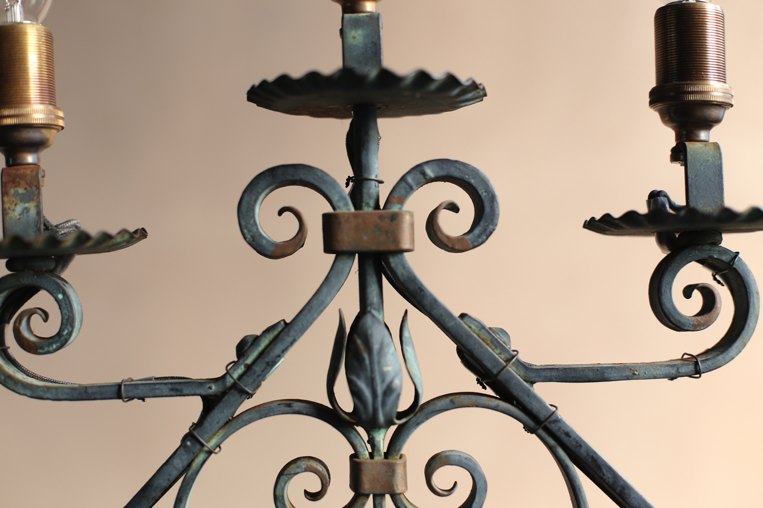 かつて蝋燭スタンドとして使われていた形状を電灯仕様に改造したものと考えられます。